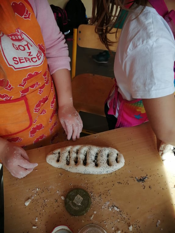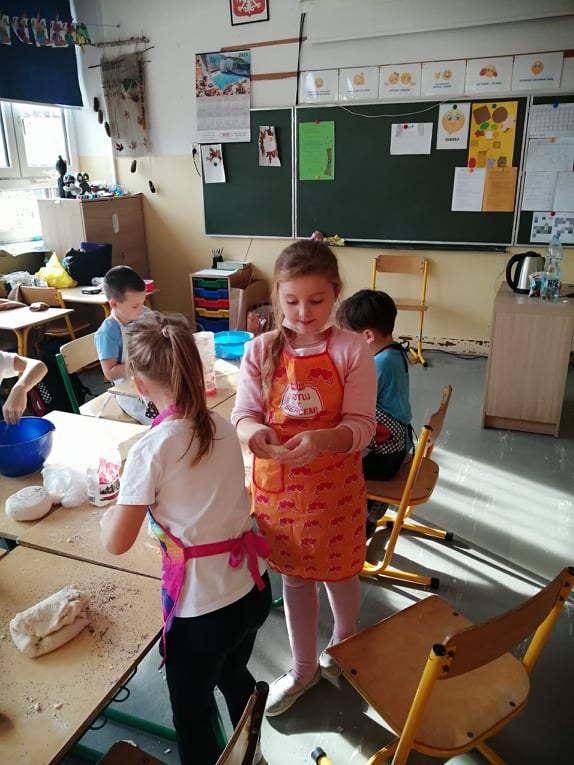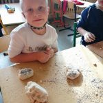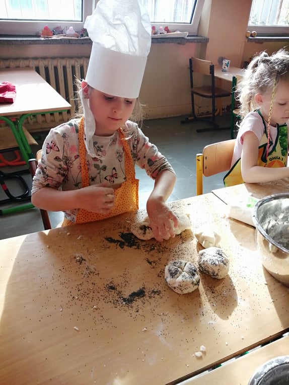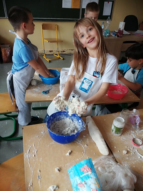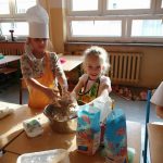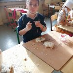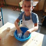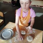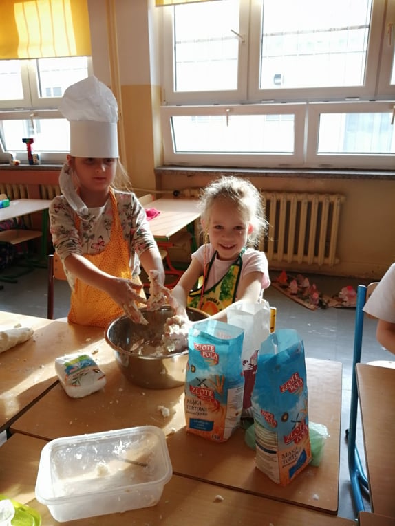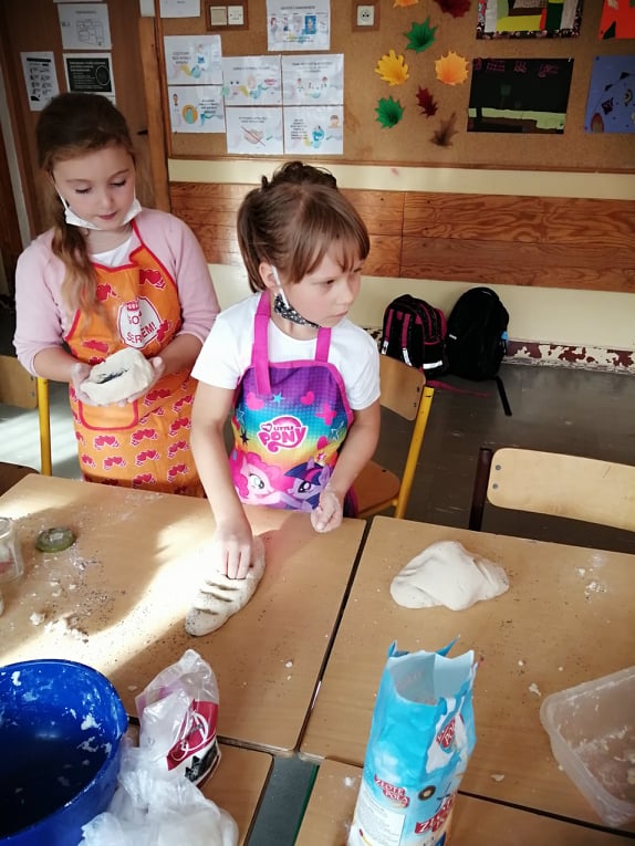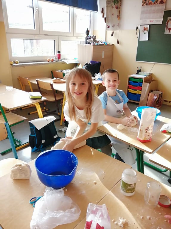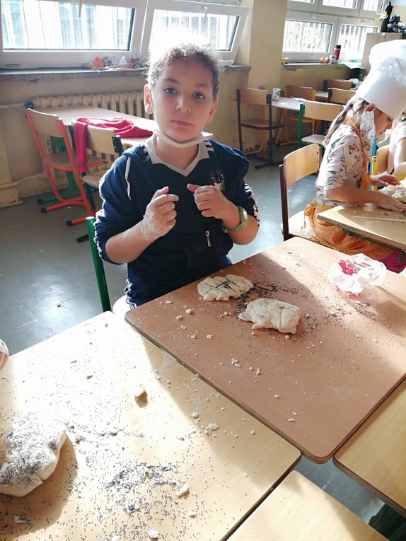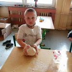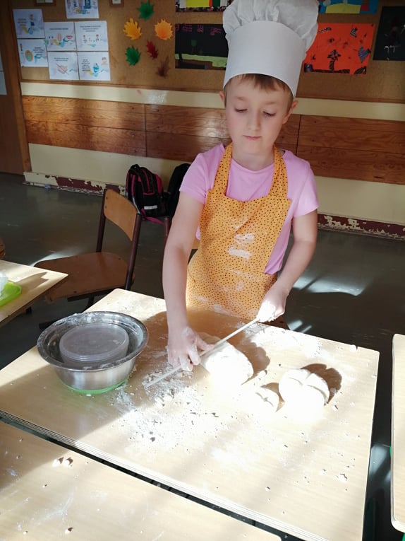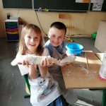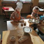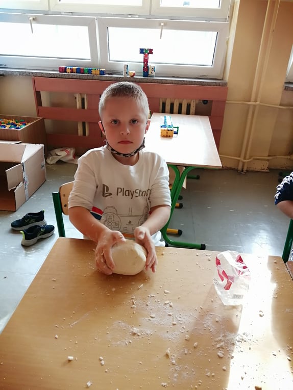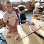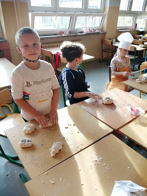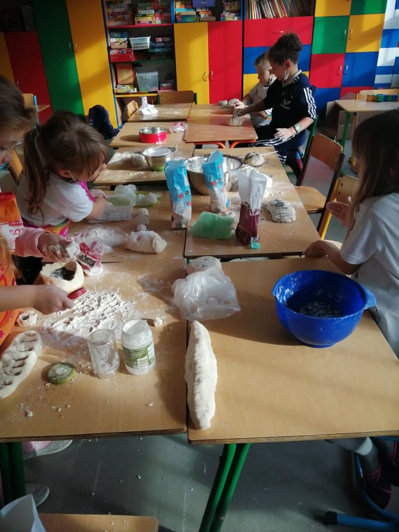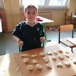 Natomiast   uczniowie  z klasy 1b przygotowywali pieczywo z masy solnej. Byli bardzo zaangażowani w robienie ciasta i formowanie pieczywa.