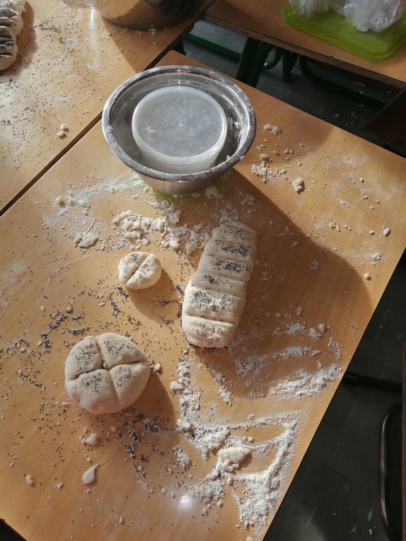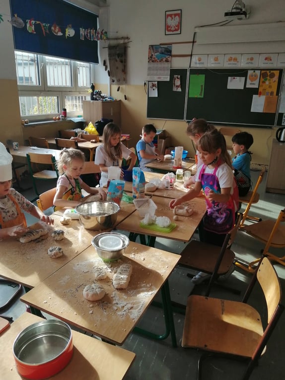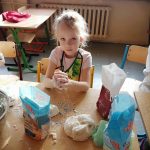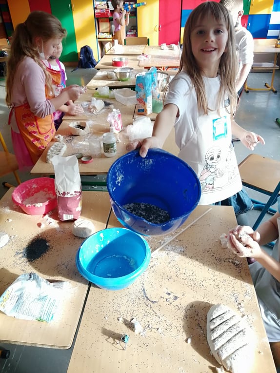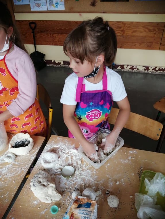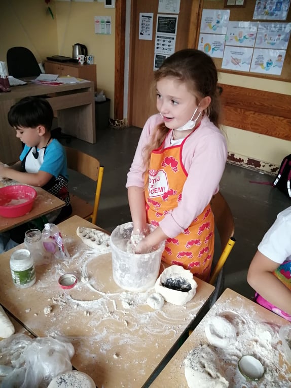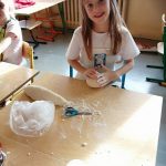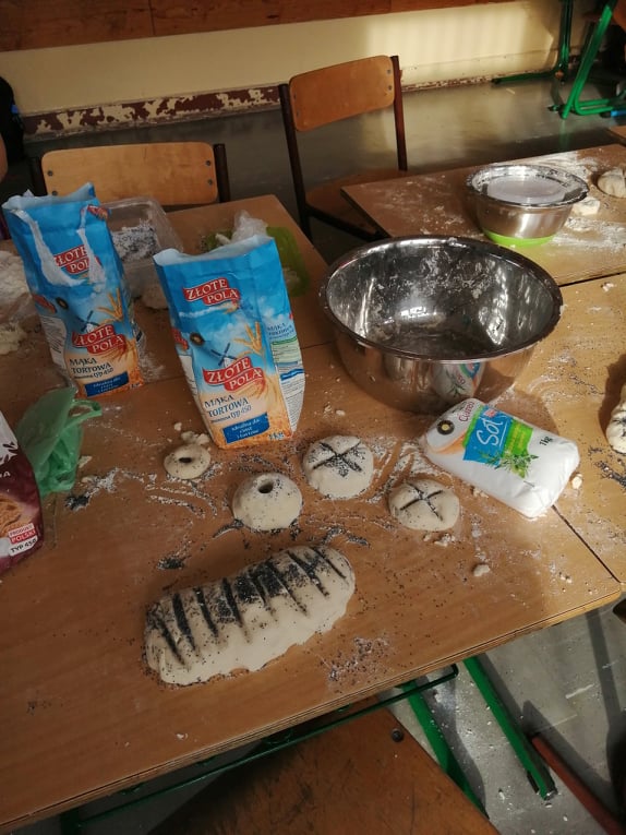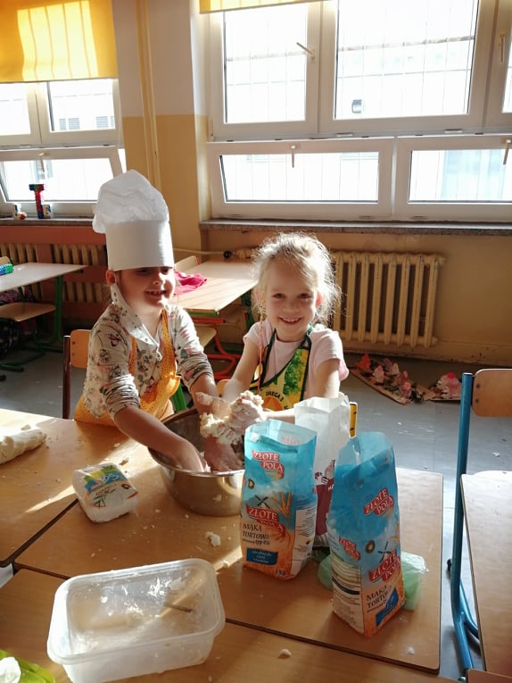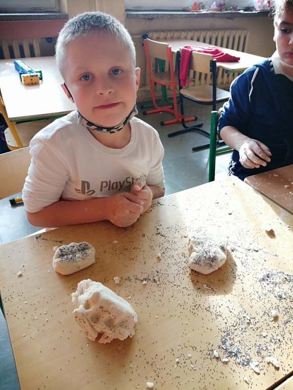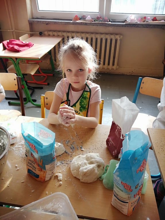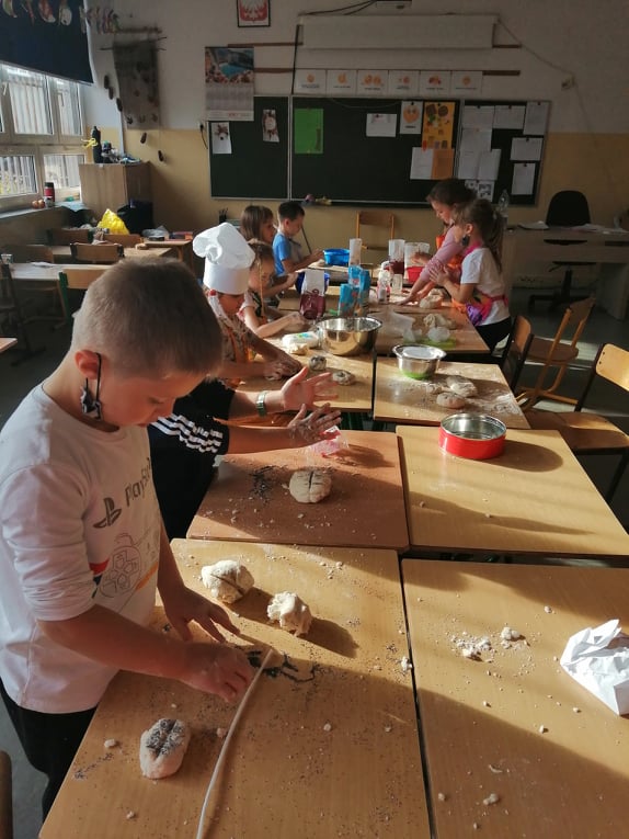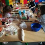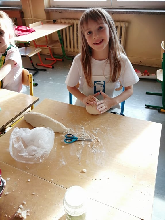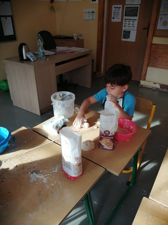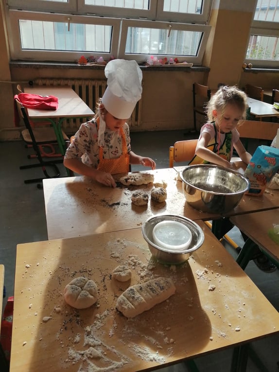 Natomiast   uczniowie  z klasy 1b przygotowywali pieczywo z masy solnej. Byli bardzo zaangażowani w robienie ciasta i formowanie pieczywa.