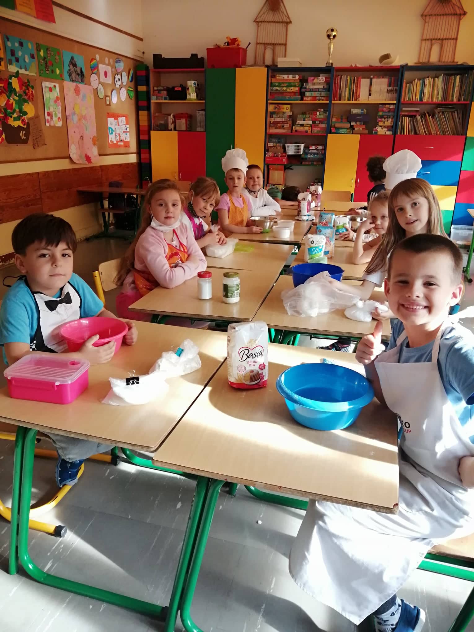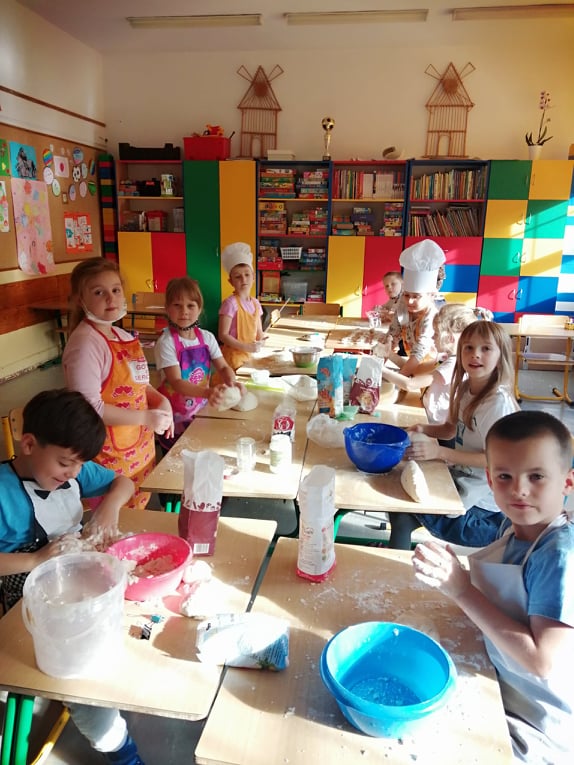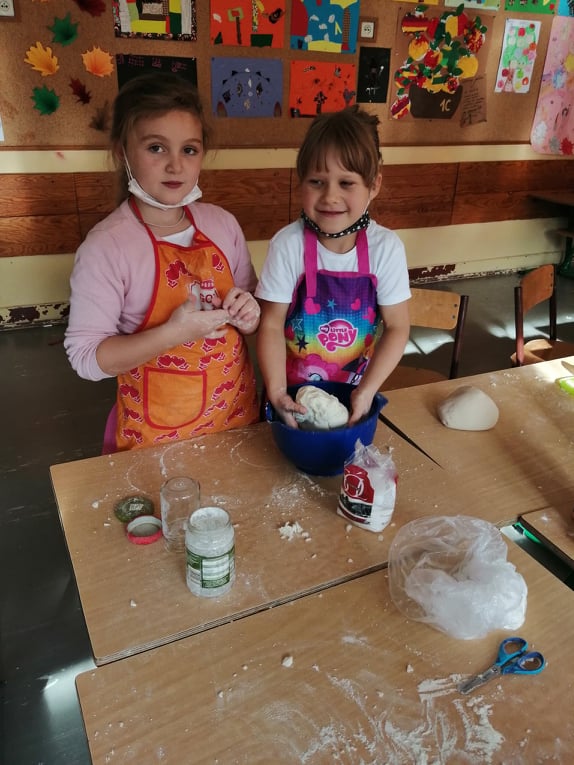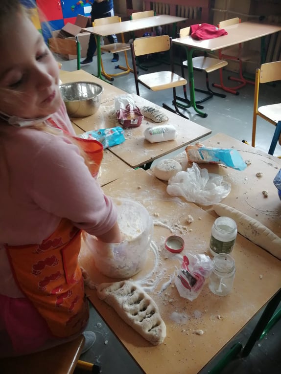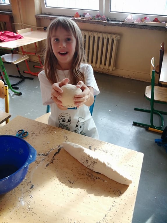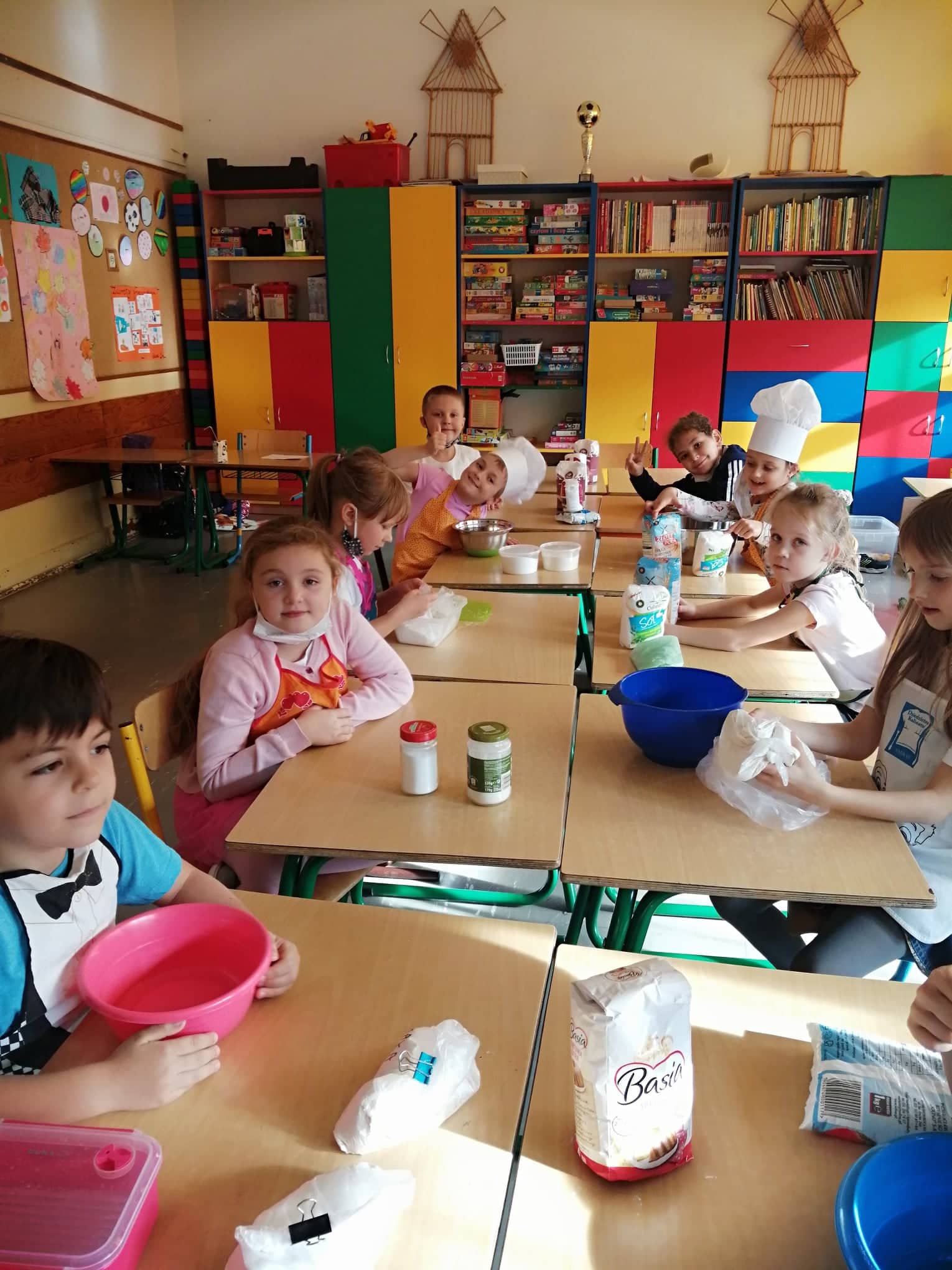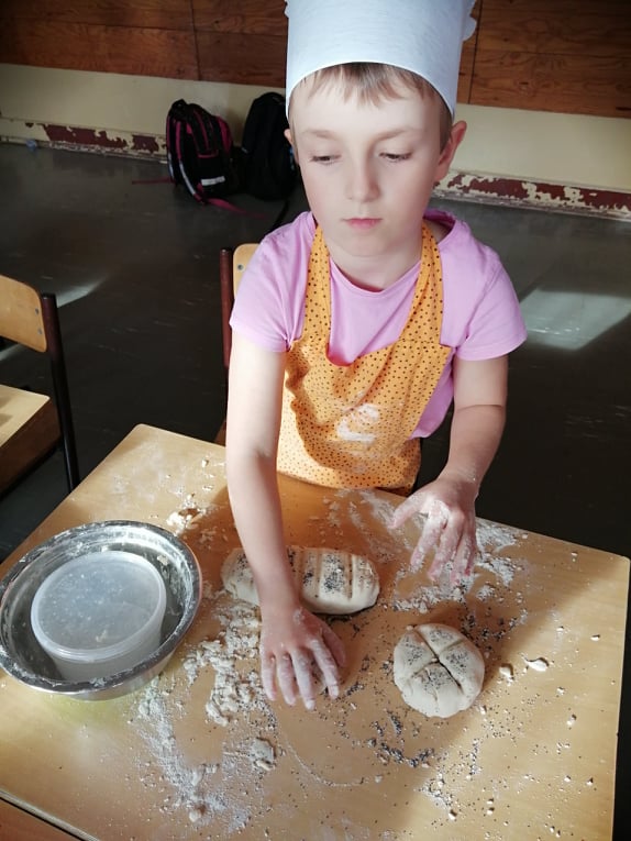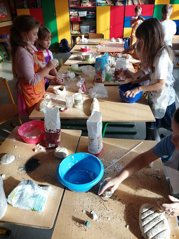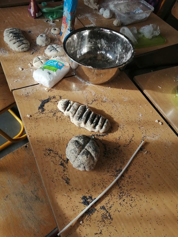 Natomiast   uczniowie  z klasy 1b przygotowywali pieczywo z masy solnej. Byli bardzo zaangażowani w robienie ciasta i formowanie pieczywa.