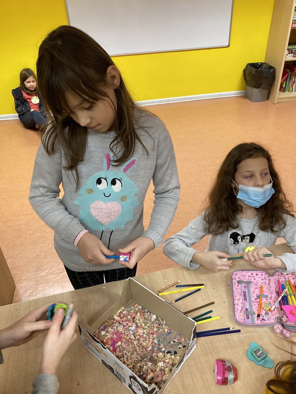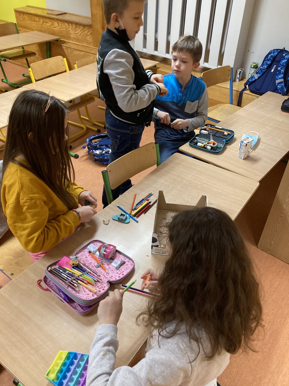 Uczniowie mogli przynieść z domu niekompletne, częściowo zużyte oraz niepotrzebne kredki i zostawić je w specjalnym pudełku na korytarzu szkolnym.