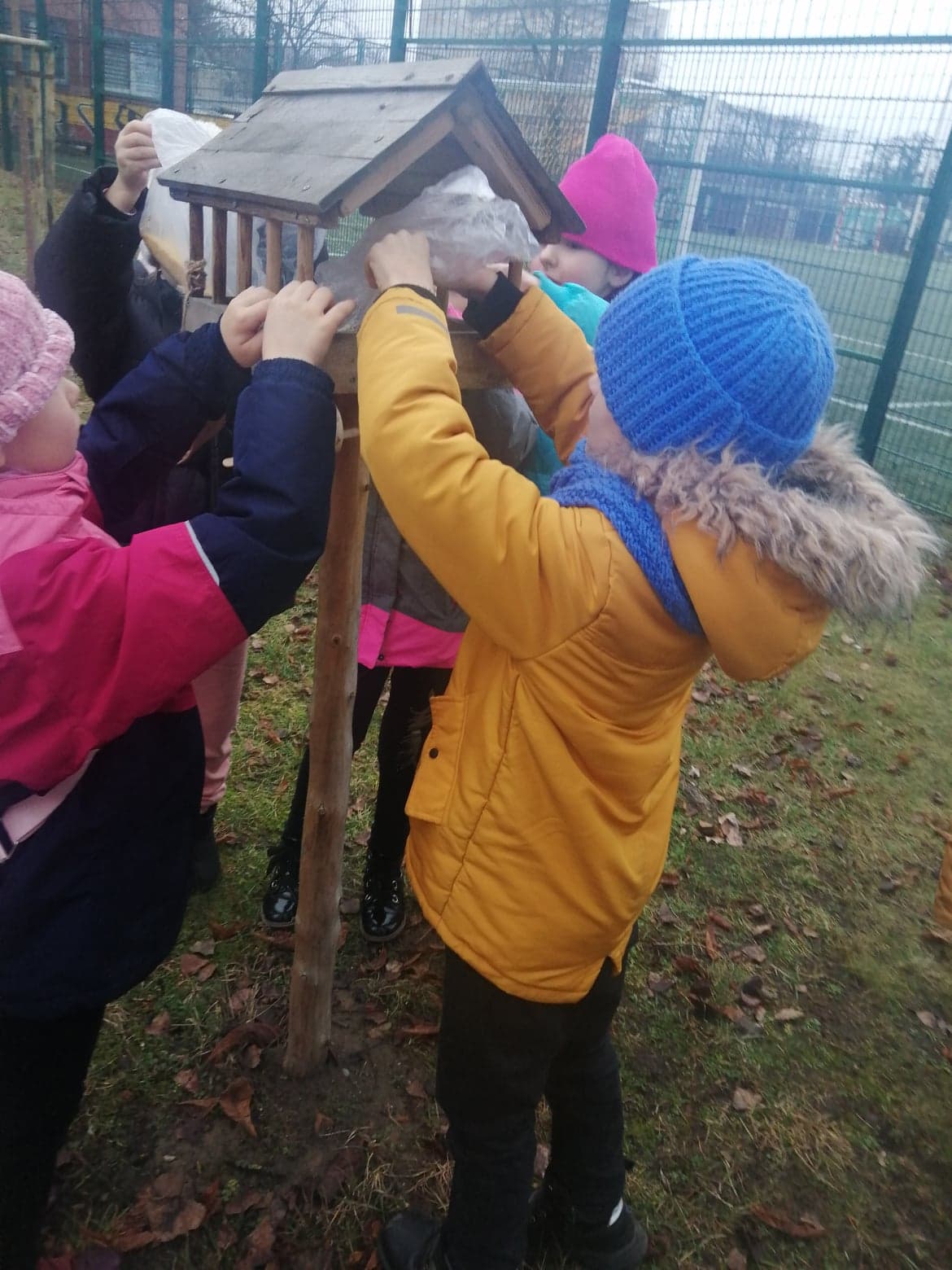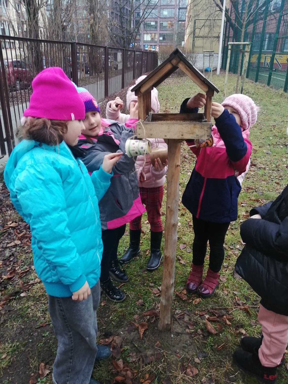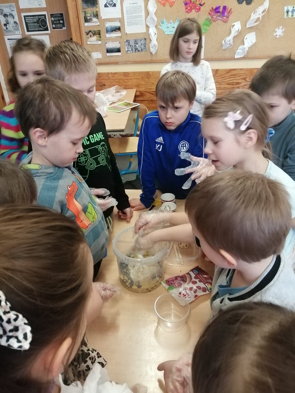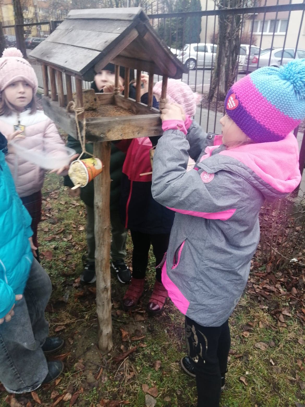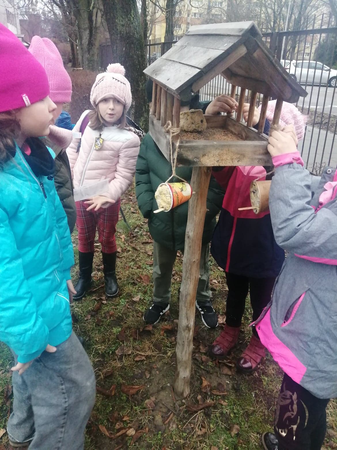 Eko Zima w 2b. Uczniowie skupili się na dokarmianiu ptaków zimą. Najpierw obejrzeli prezentację na temat „Zwierzęta zimą”, a potem wykonali ekologiczną karmę dla ptaków, wykonaną ze smalcu, żurawiny, słonecznika i kaszy jaglanej. Karma zawisła na karmniku, którym uczniowie opiekują się od pierwszej klasy.