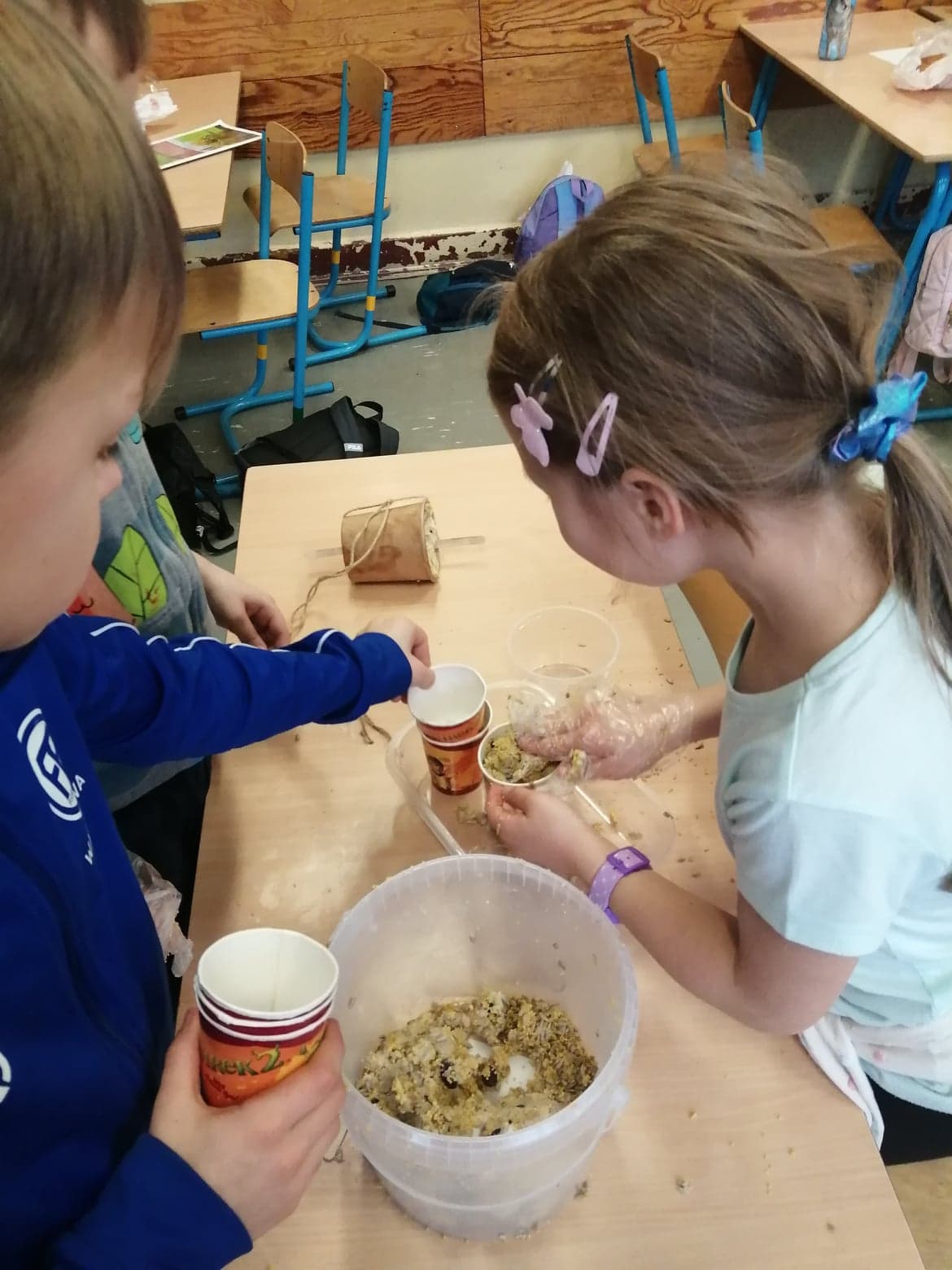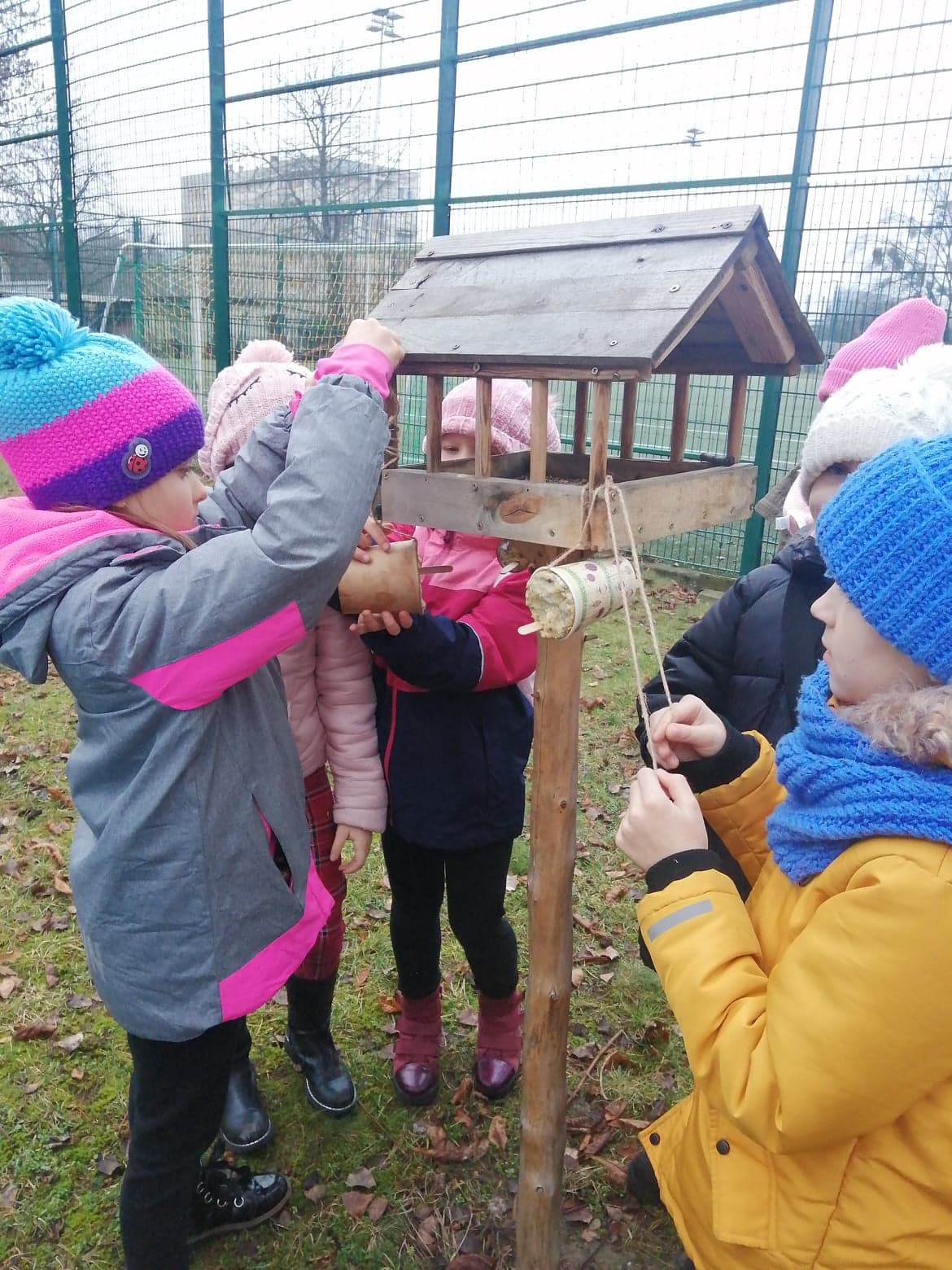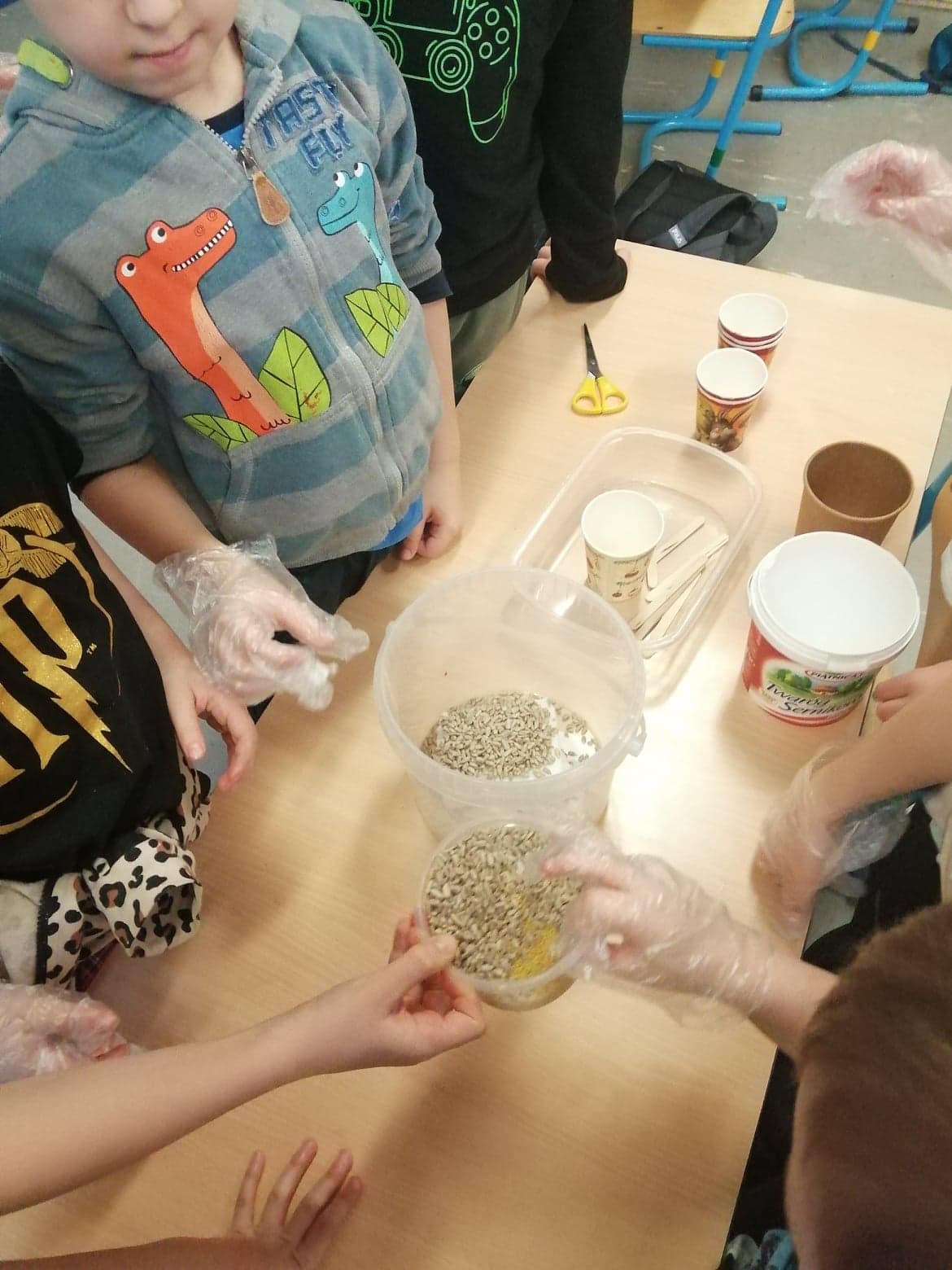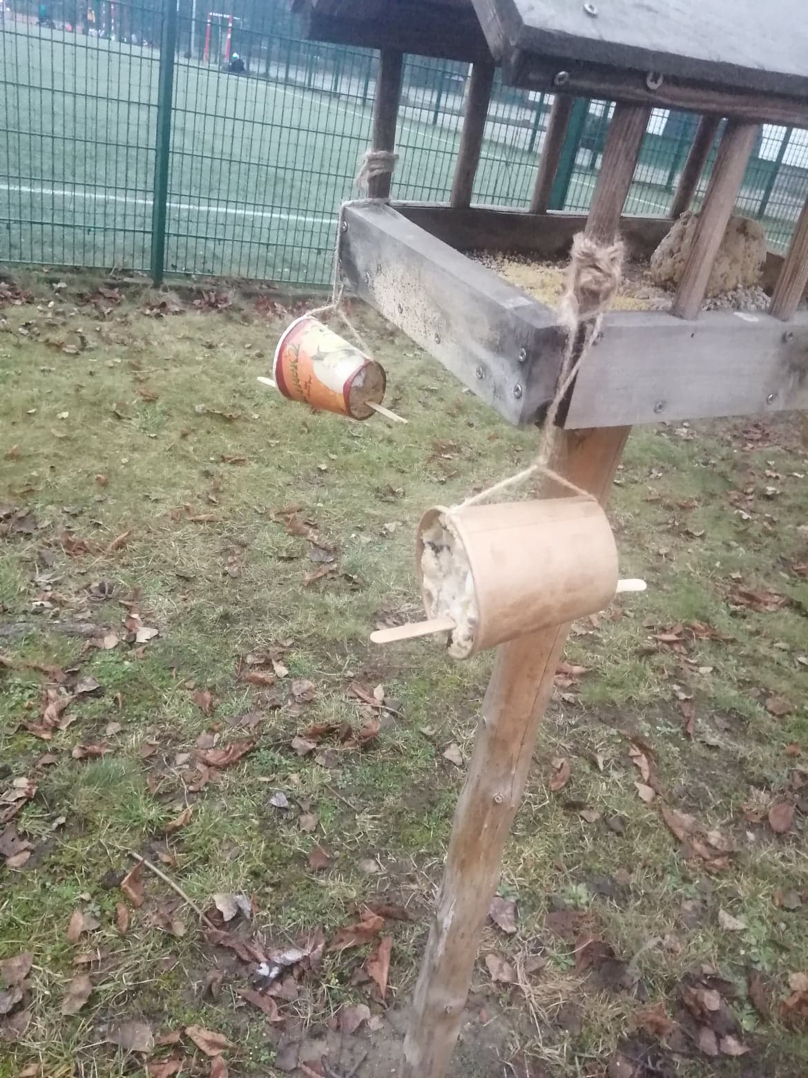 Eko Zima w 2b. Uczniowie skupili się na dokarmianiu ptaków zimą. Najpierw obejrzeli prezentację na temat „Zwierzęta zimą”, a potem wykonali ekologiczną karmę dla ptaków, wykonaną ze smalcu, żurawiny, słonecznika i kaszy jaglanej. Karma zawisła na karmniku, którym uczniowie opiekują się od pierwszej klasy.