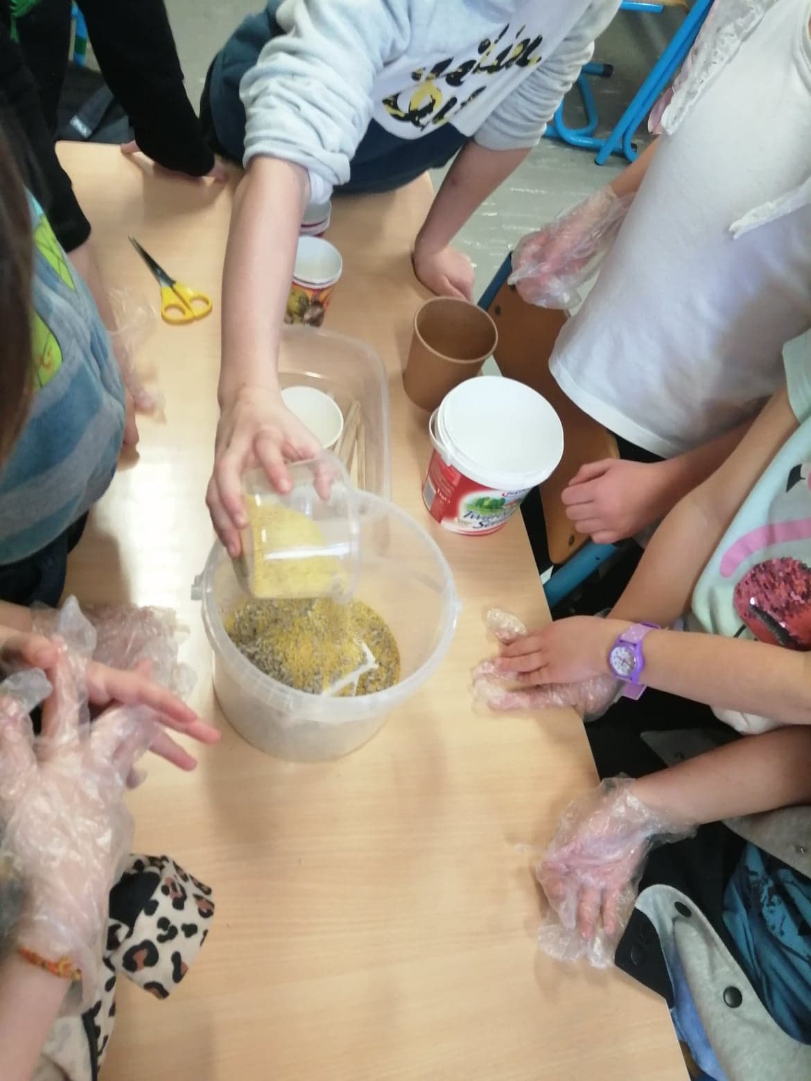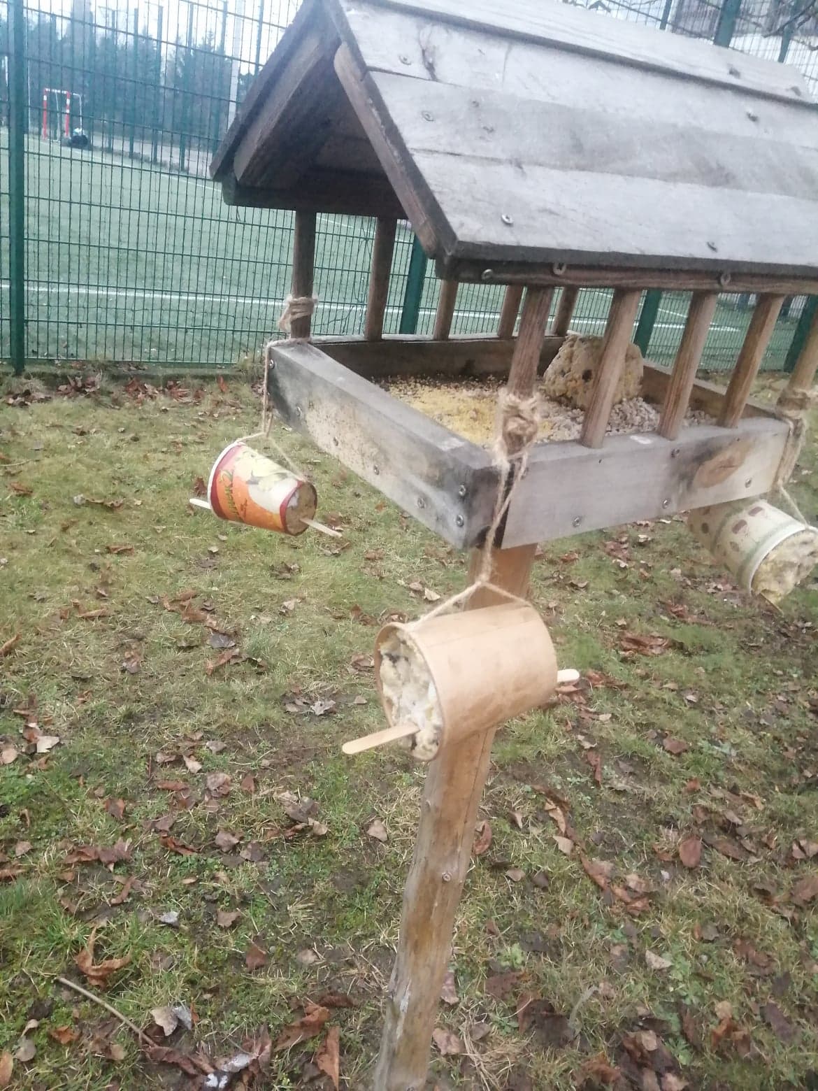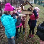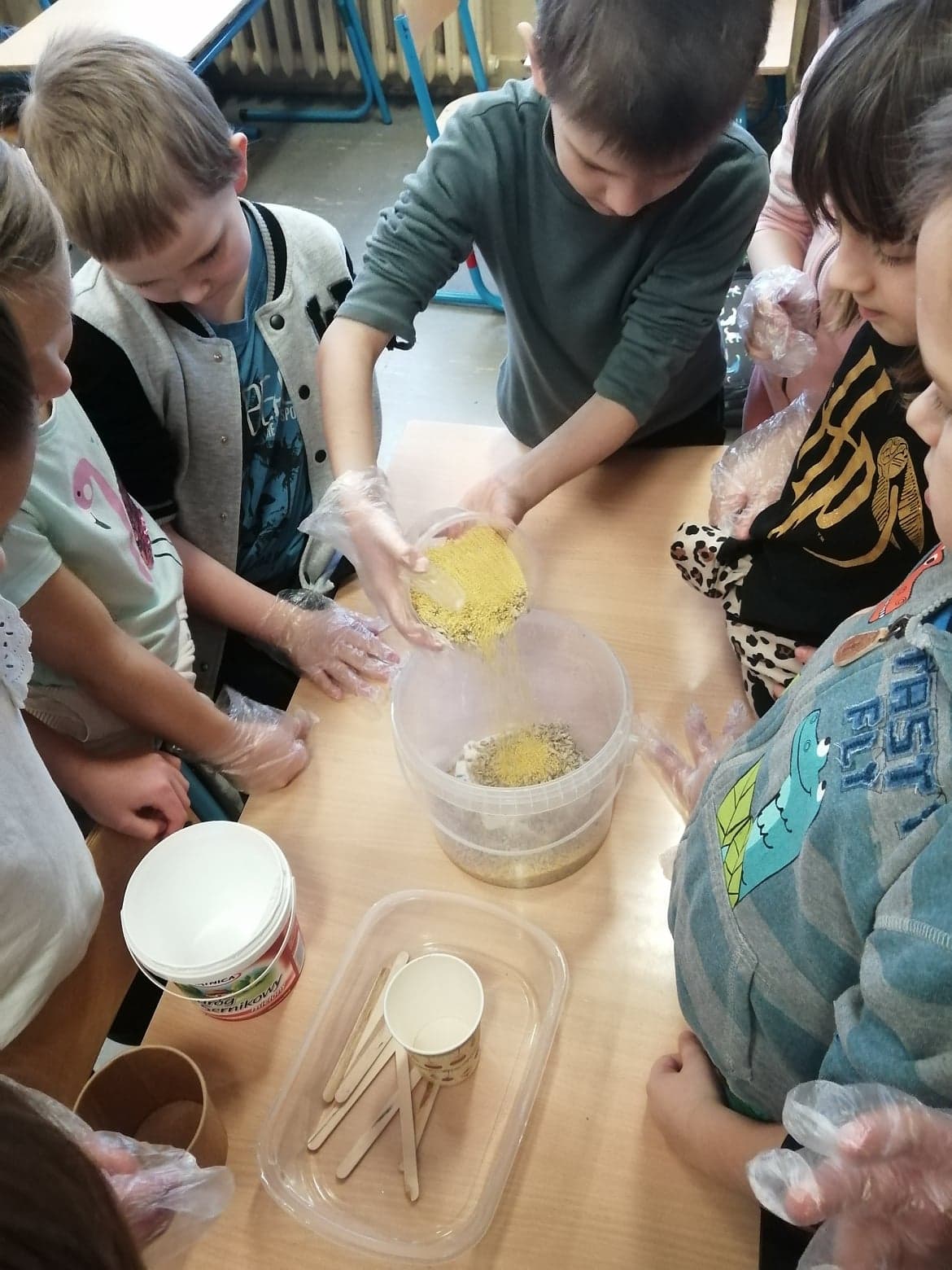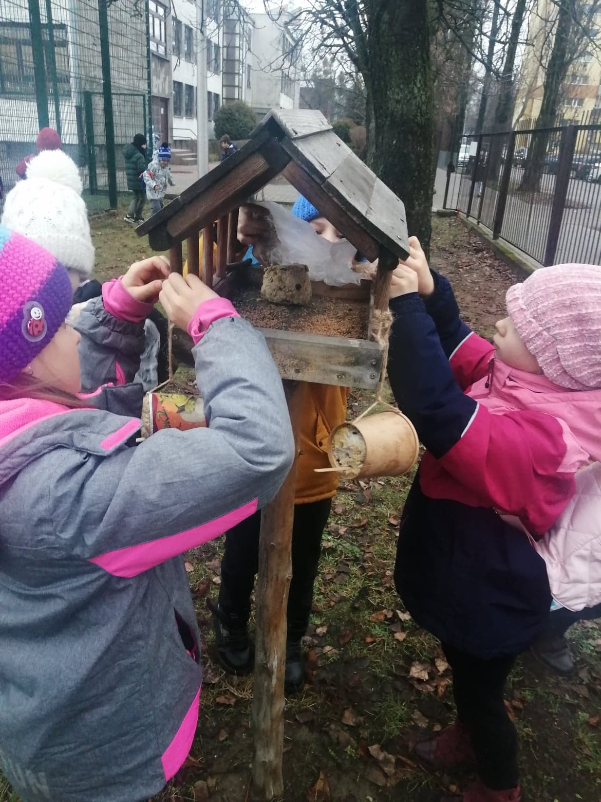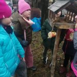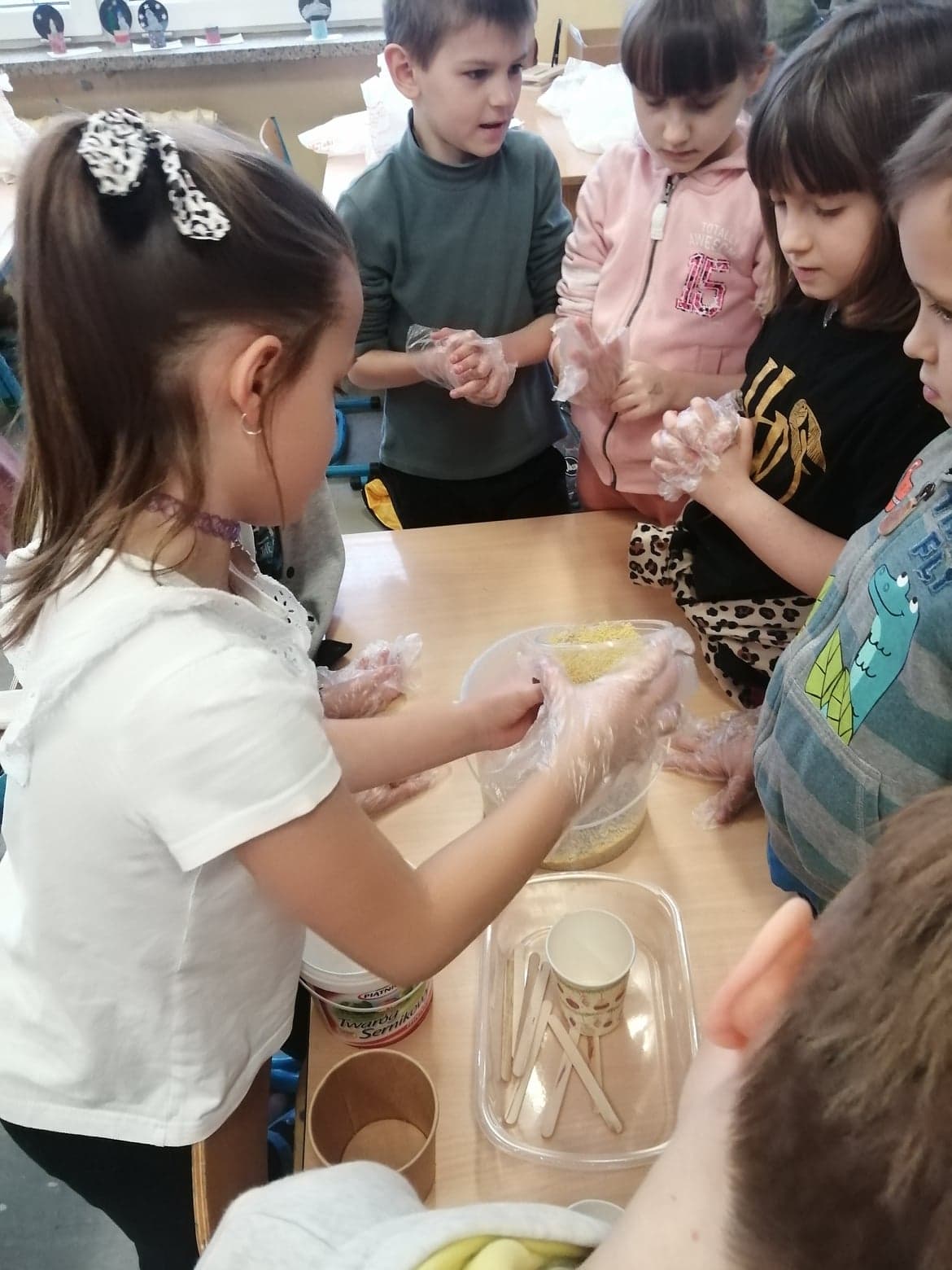 Eko Zima w 2b. Uczniowie skupili się na dokarmianiu ptaków zimą. Najpierw obejrzeli prezentację na temat „Zwierzęta zimą”, a potem wykonali ekologiczną karmę dla ptaków, wykonaną ze smalcu, żurawiny, słonecznika i kaszy jaglanej. Karma zawisła na karmniku, którym uczniowie opiekują się od pierwszej klasy.