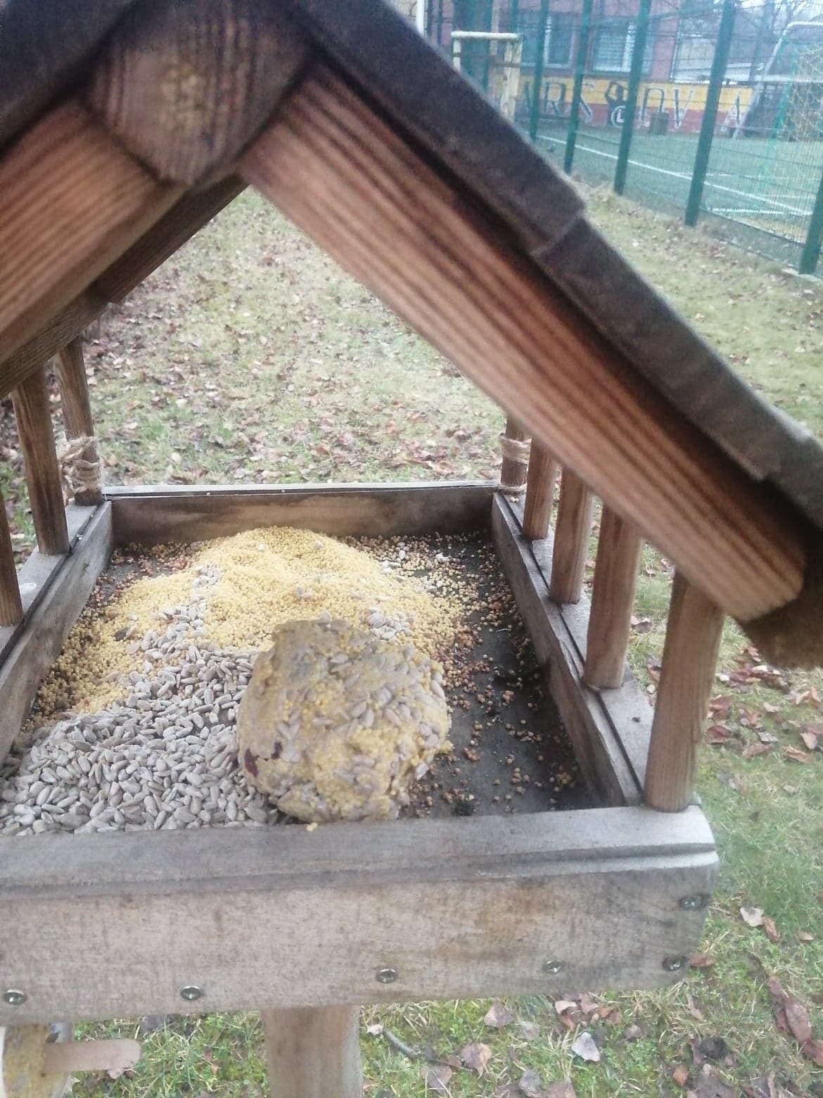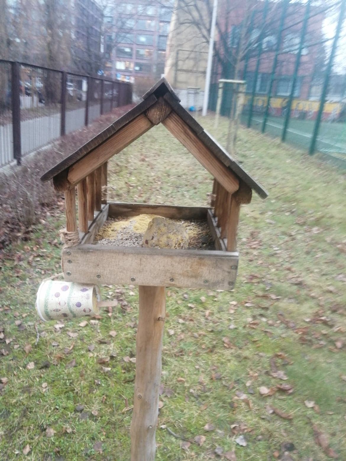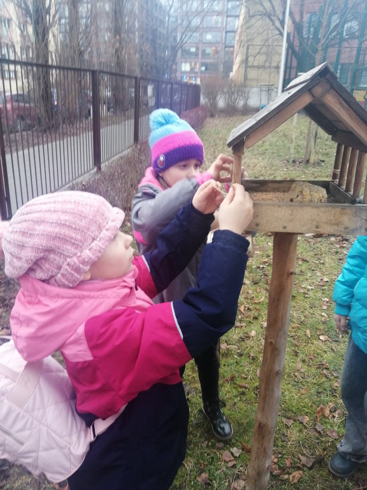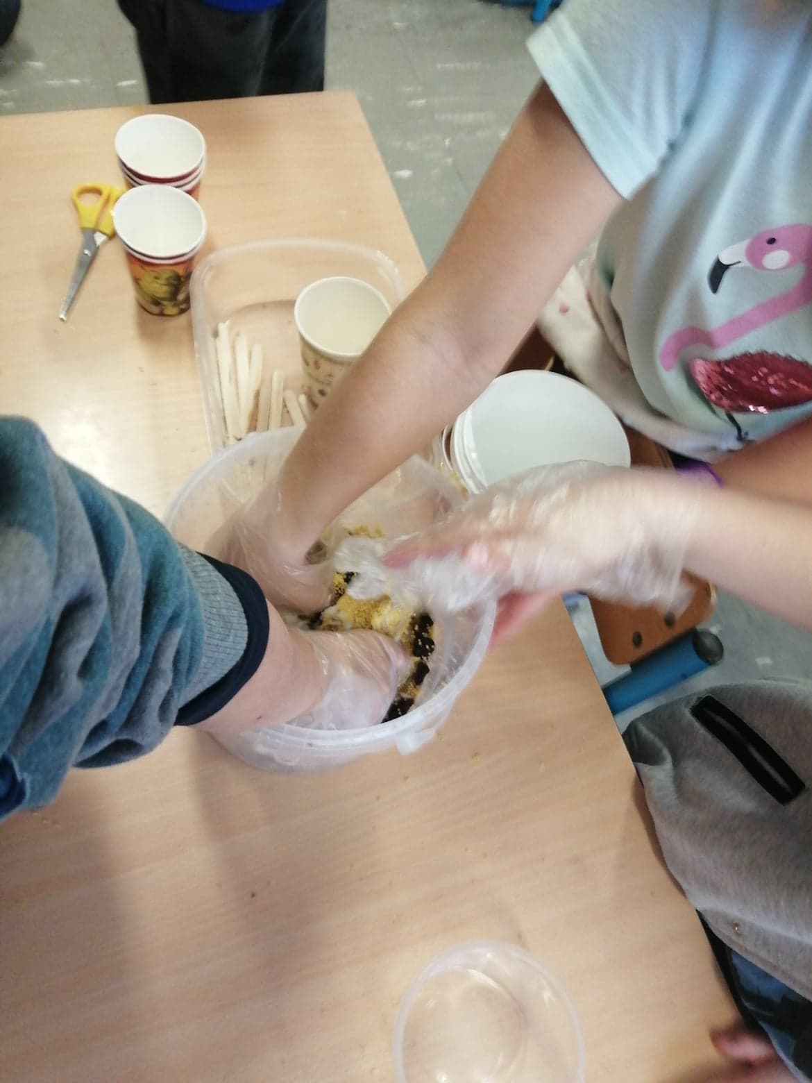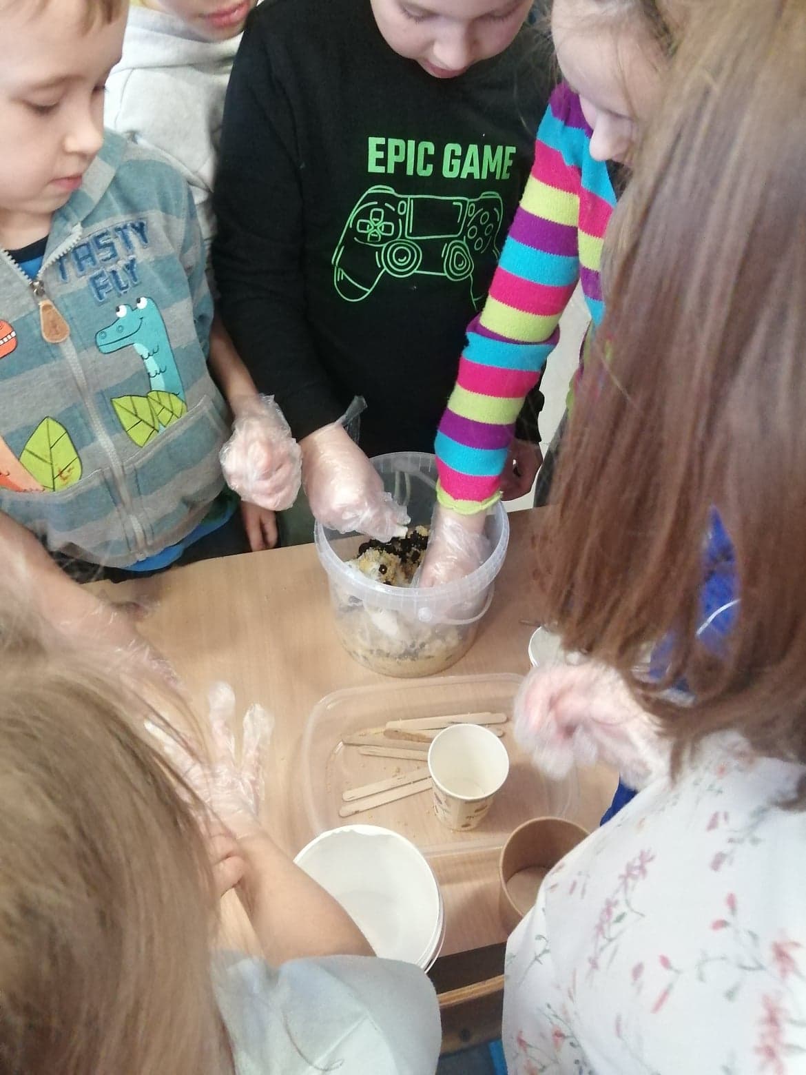 Eko Zima w 2b. Uczniowie skupili się na dokarmianiu ptaków zimą. Najpierw obejrzeli prezentację na temat „Zwierzęta zimą”, a potem wykonali ekologiczną karmę dla ptaków, wykonaną ze smalcu, żurawiny, słonecznika i kaszy jaglanej. Karma zawisła na karmniku, którym uczniowie opiekują się od pierwszej klasy.