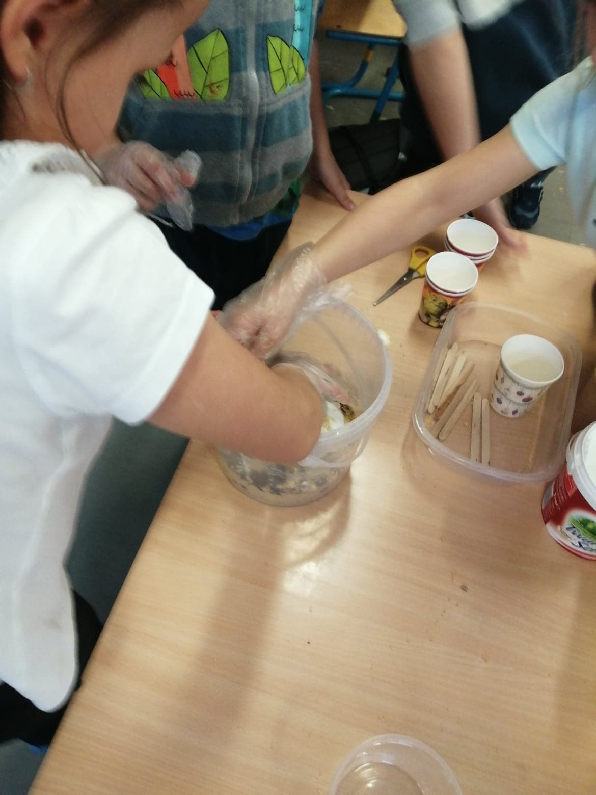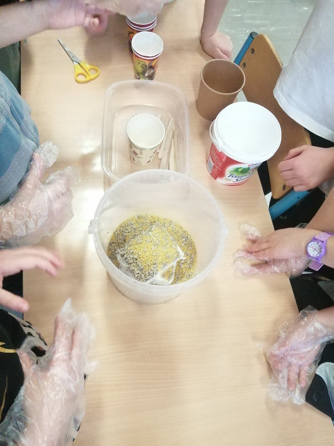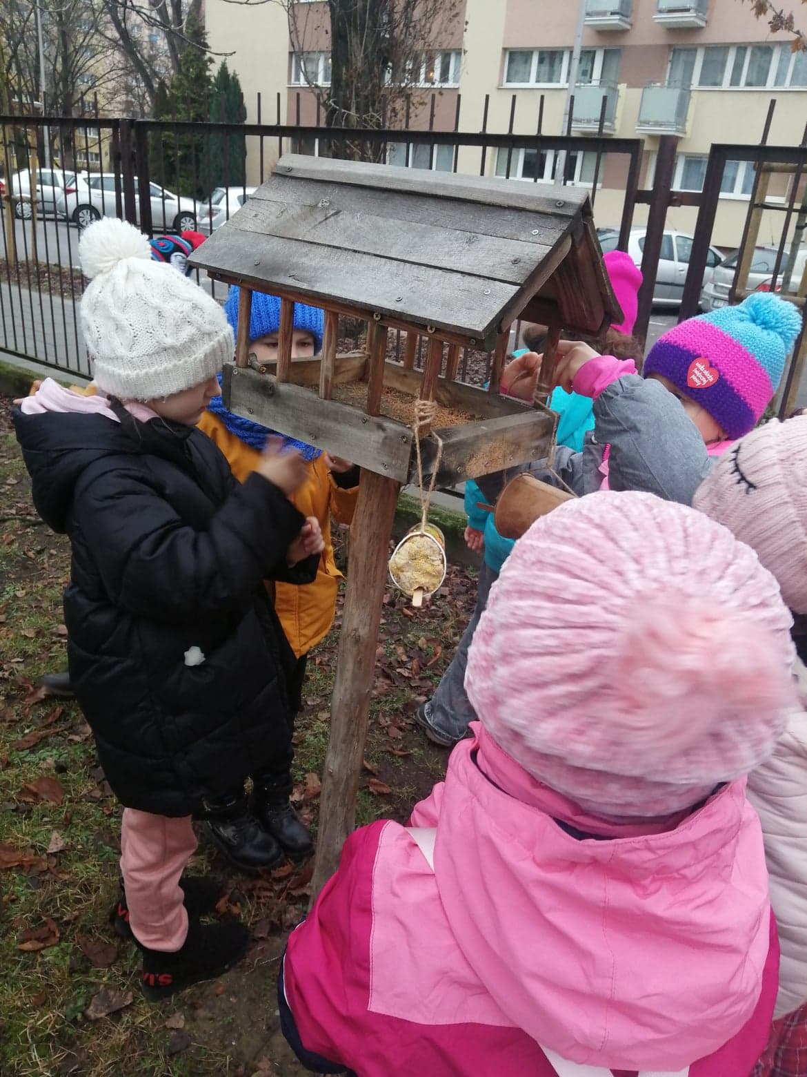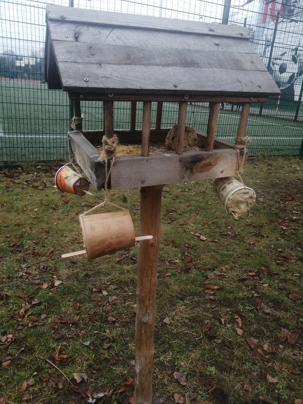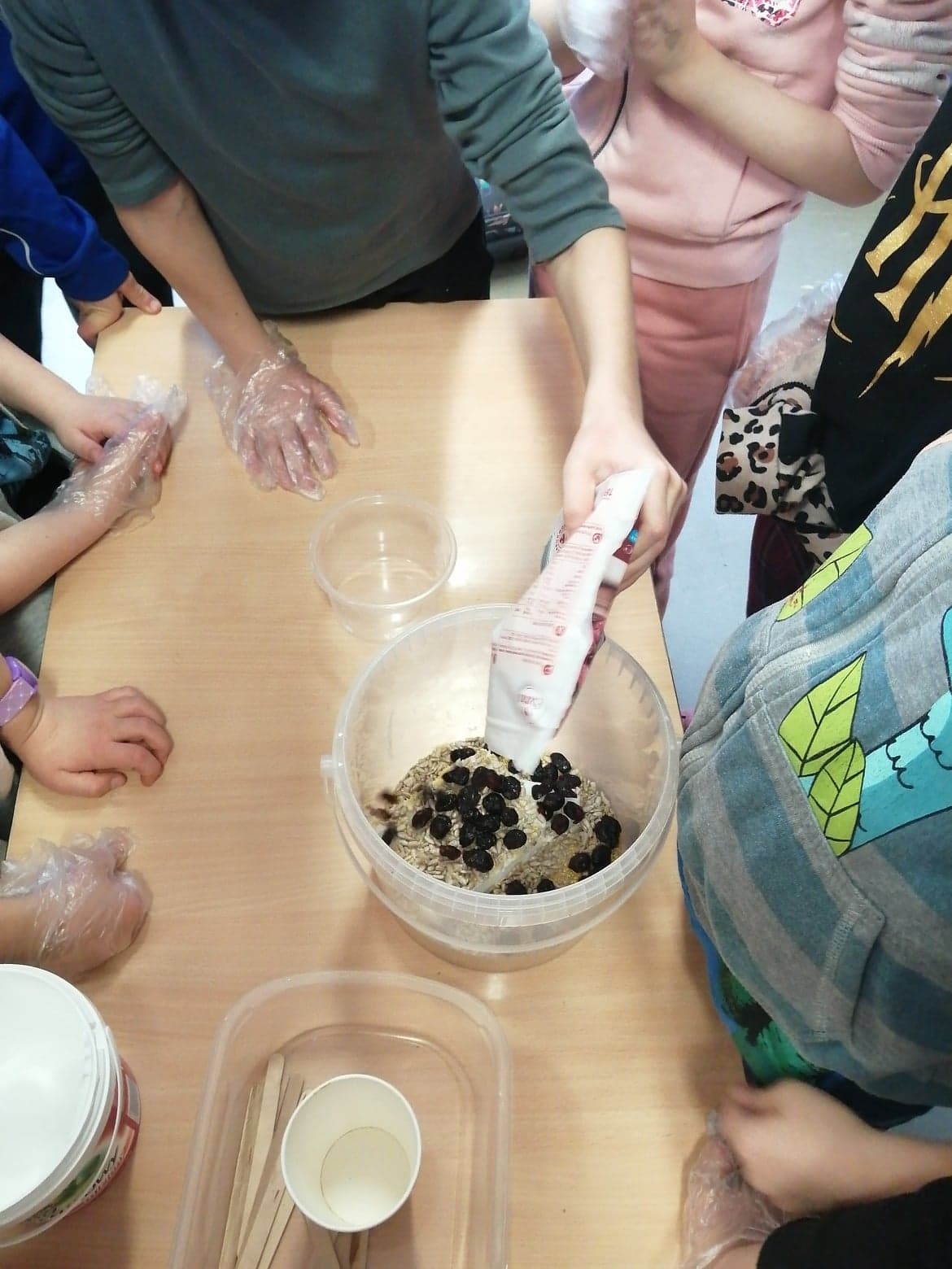 Eko Zima w 2b. Uczniowie skupili się na dokarmianiu ptaków zimą. Najpierw obejrzeli prezentację na temat „Zwierzęta zimą”, a potem wykonali ekologiczną karmę dla ptaków, wykonaną ze smalcu, żurawiny, słonecznika i kaszy jaglanej. Karma zawisła na karmniku, którym uczniowie opiekują się od pierwszej klasy.