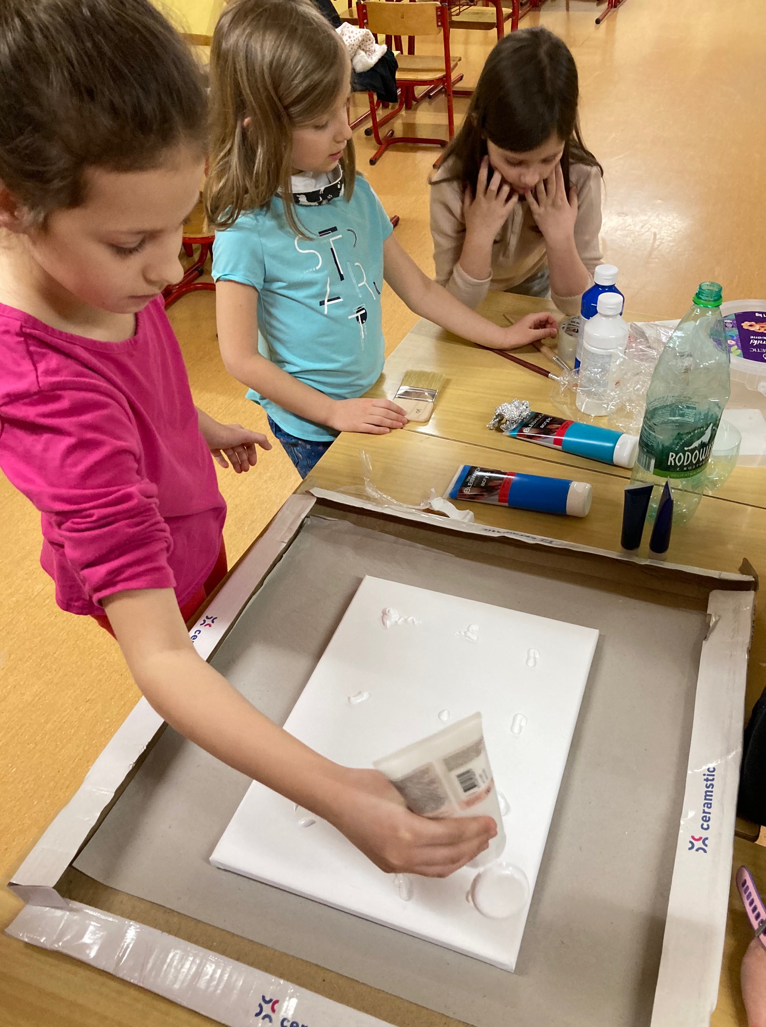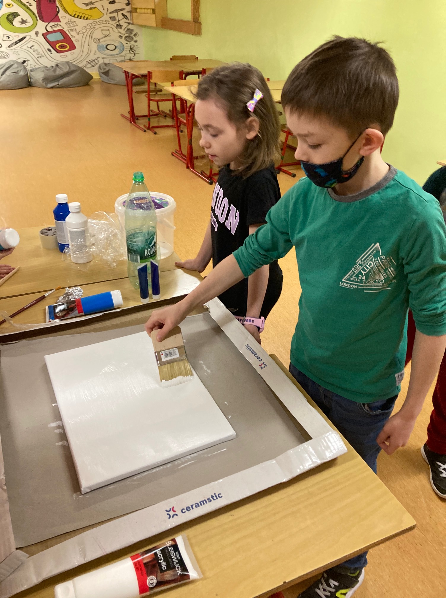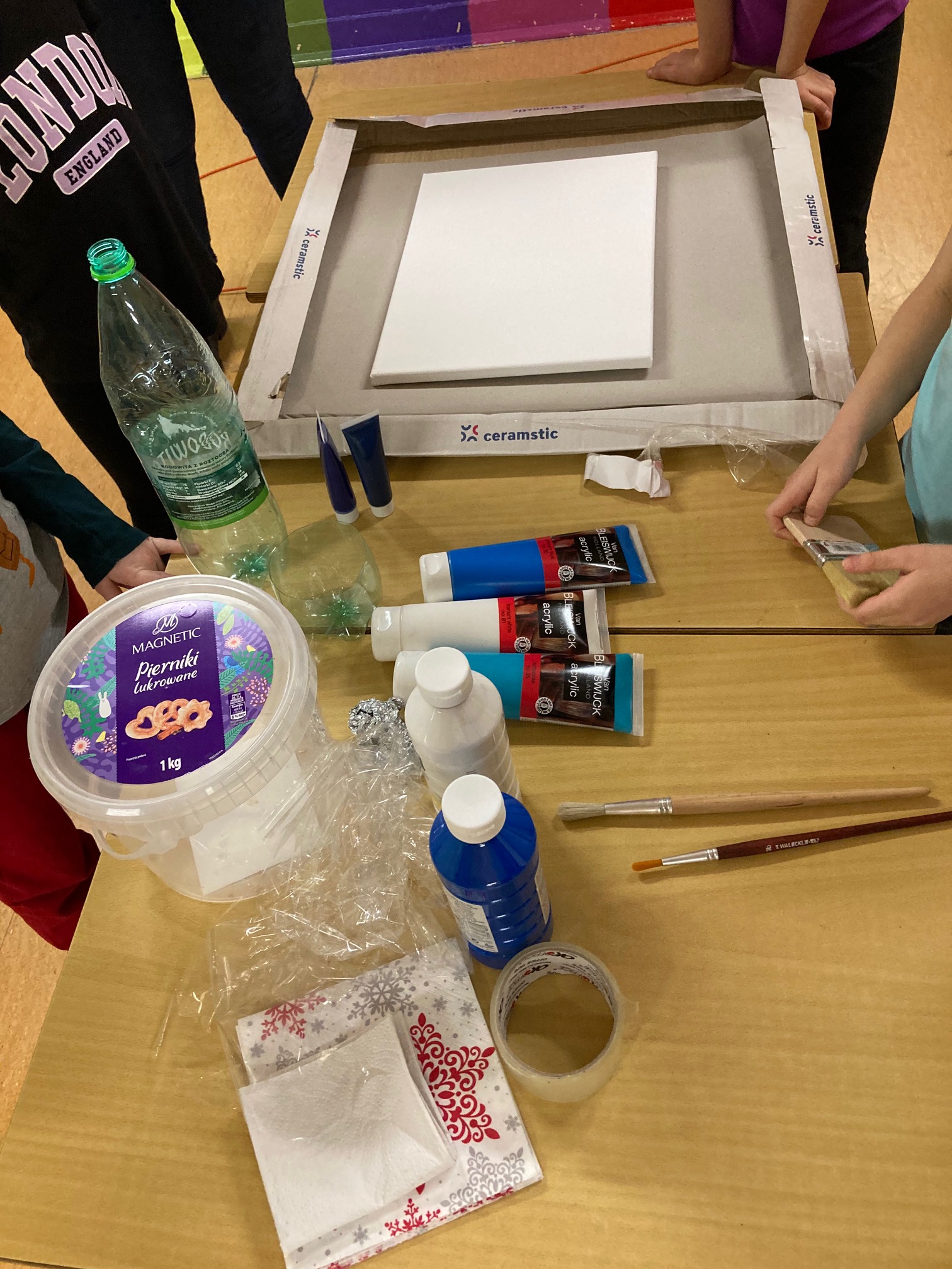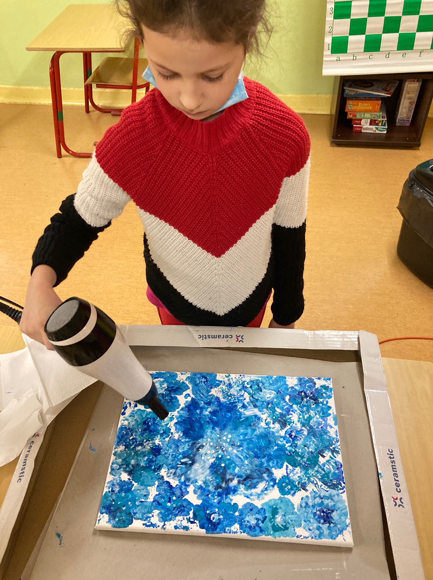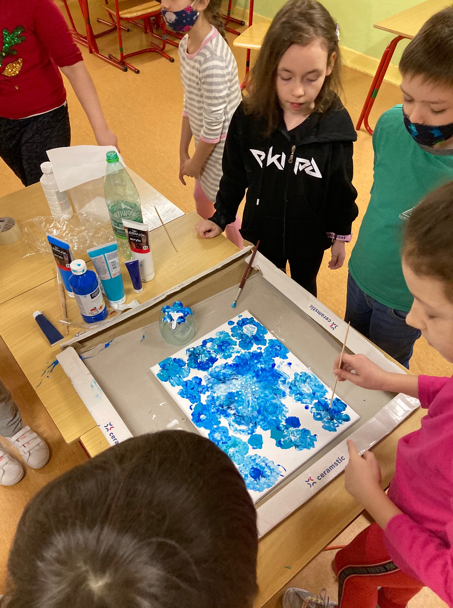 Kto powiedział, że obrazy maluje się tylko pędzlem jest w błędzie. Klasa 2a malowała plastikowymi butelkami, folią spożywczą, zużytymi papierami i patyczkami do grilla. Powstał obraz pt. „Zimowe kwiaty