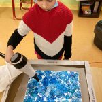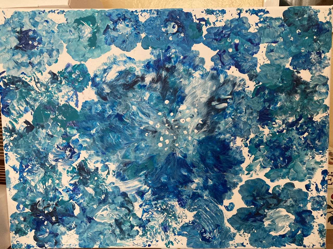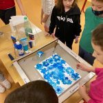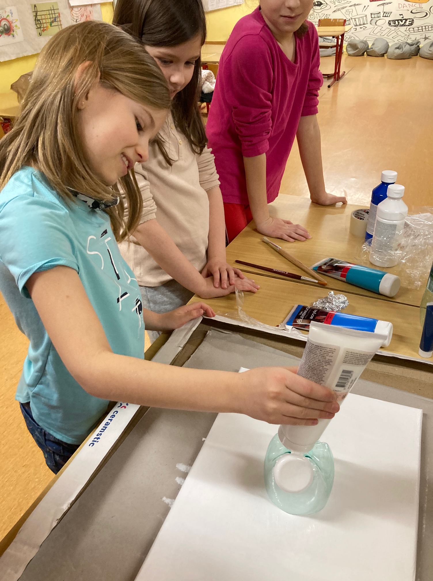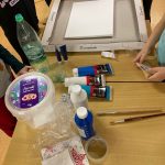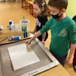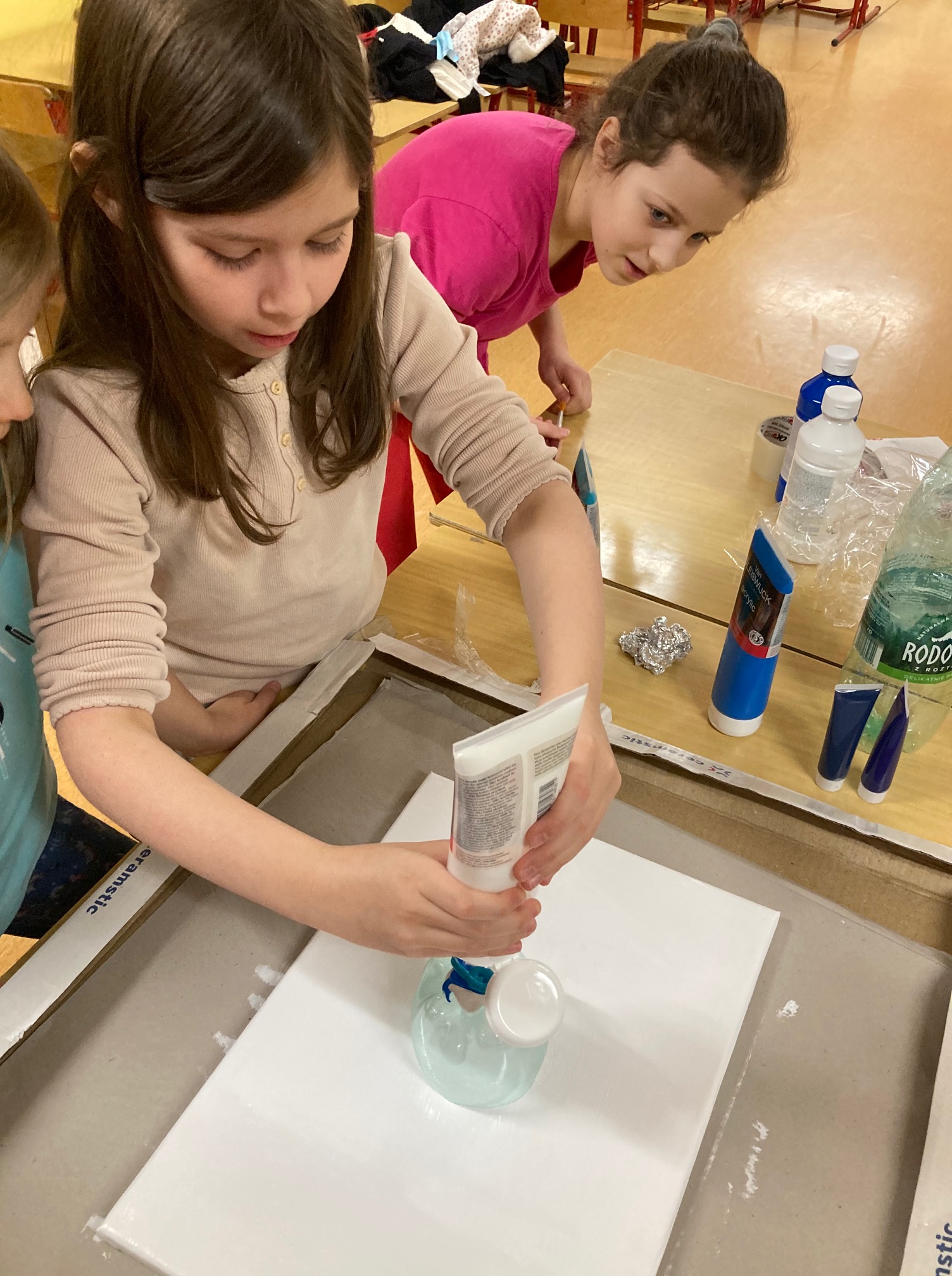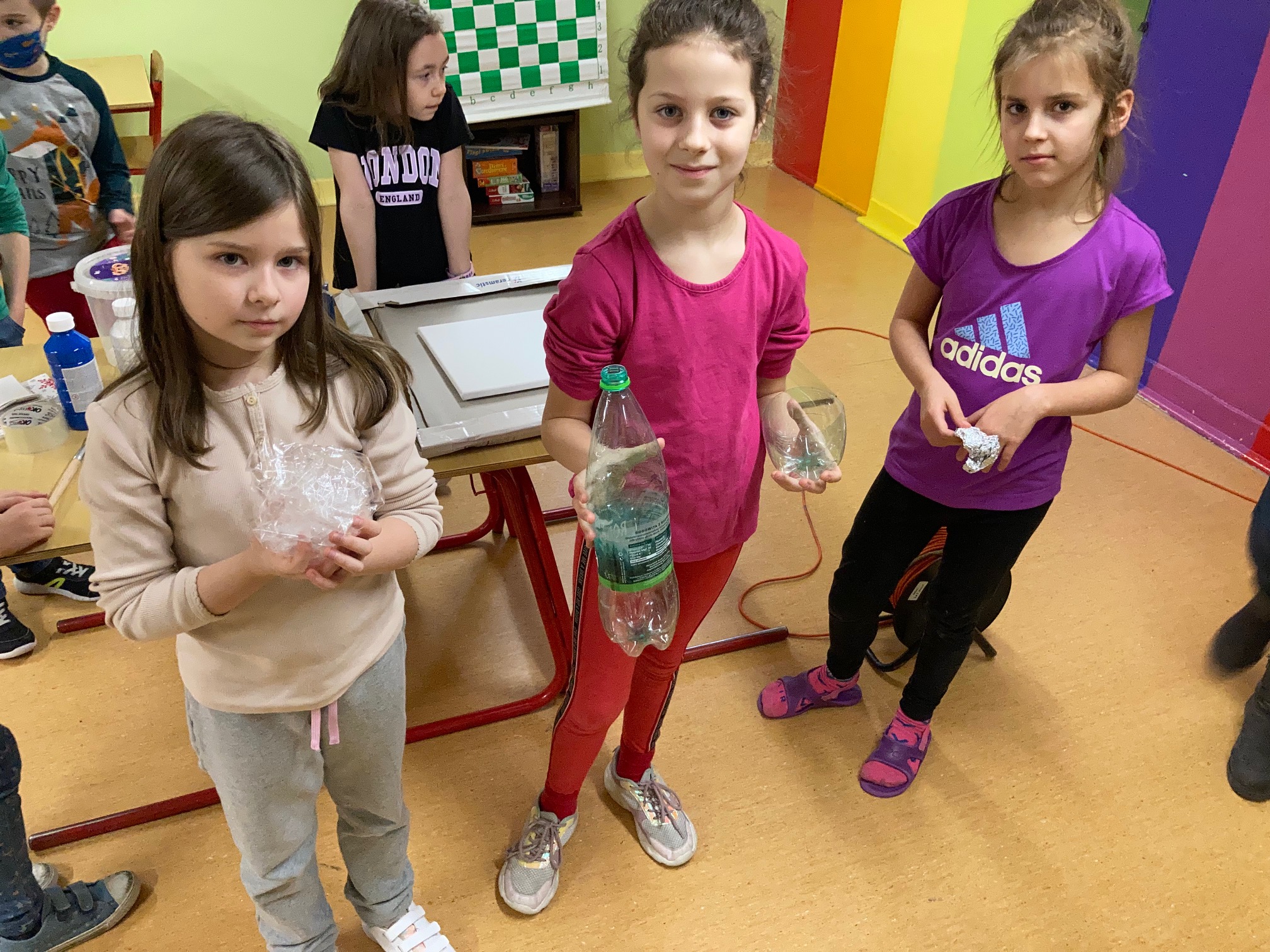 Kto powiedział, że obrazy maluje się tylko pędzlem jest w błędzie. Klasa 2a malowała plastikowymi butelkami, folią spożywczą, zużytymi papierami i patyczkami do grilla. Powstał obraz pt. „Zimowe kwiaty