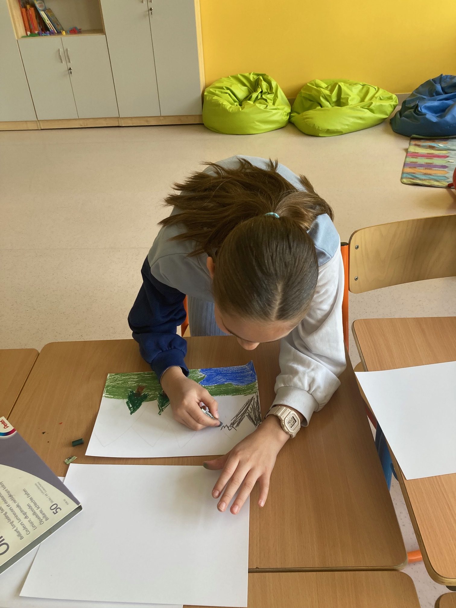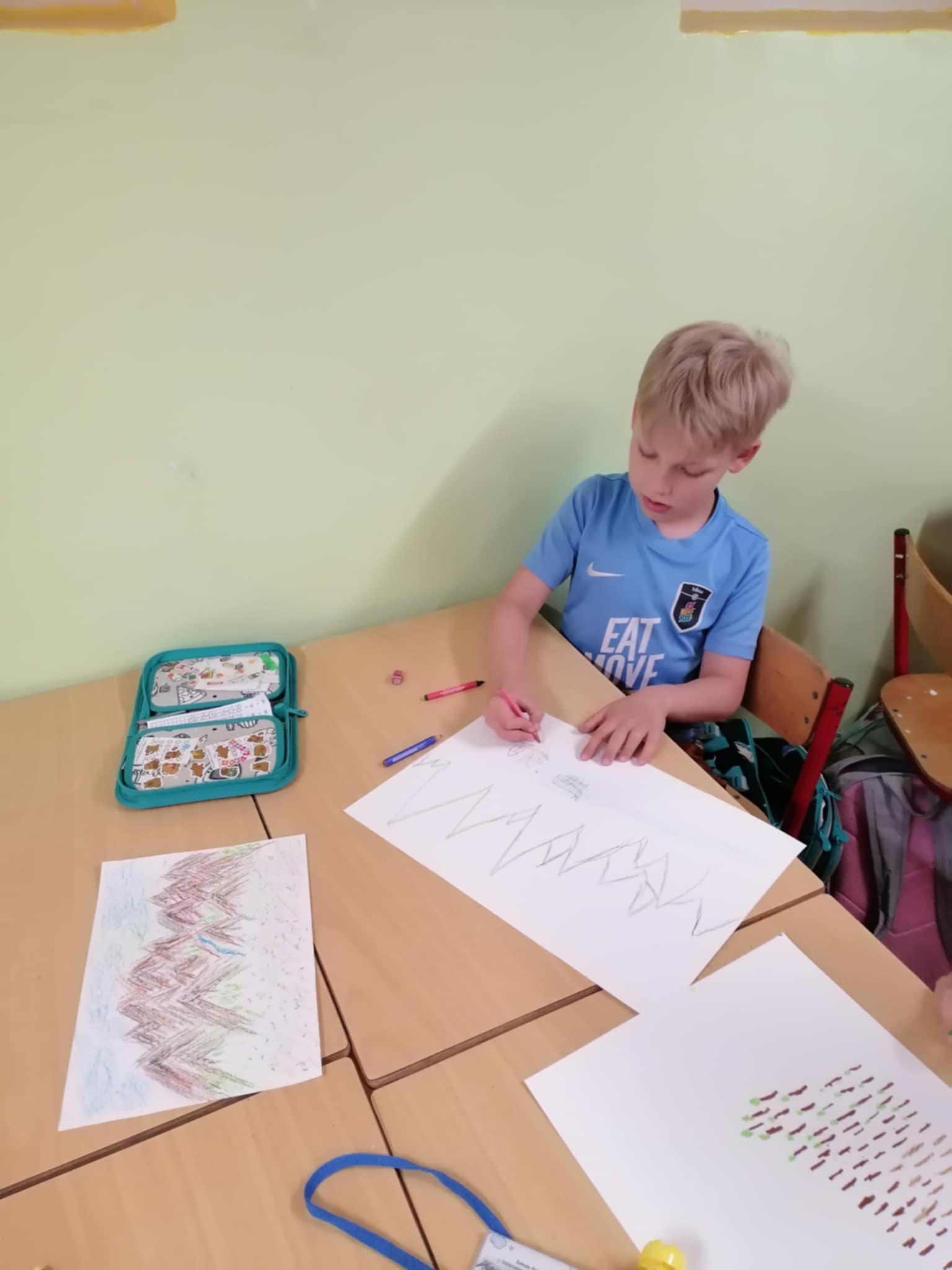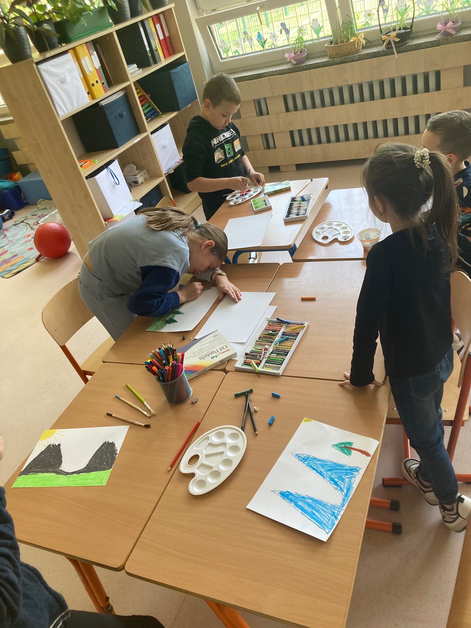 Uczniowie klasy 1a wybrali się w wyjątkową podróż – tym razem nie wędrowali szlakiem, lecz wyobraźnią i pastelami. Zainspirowani piosenką „Hej górol, Ci ja górol!” stworzyli przepiękne krajobrazy górskie, pełne barw, przestrzeni i uroku natury. Ich prace zachwycają różnorodnością i pomysłowością – można w nich dostrzec strome szczyty, zielone doliny oraz pasące się zwierzęta.