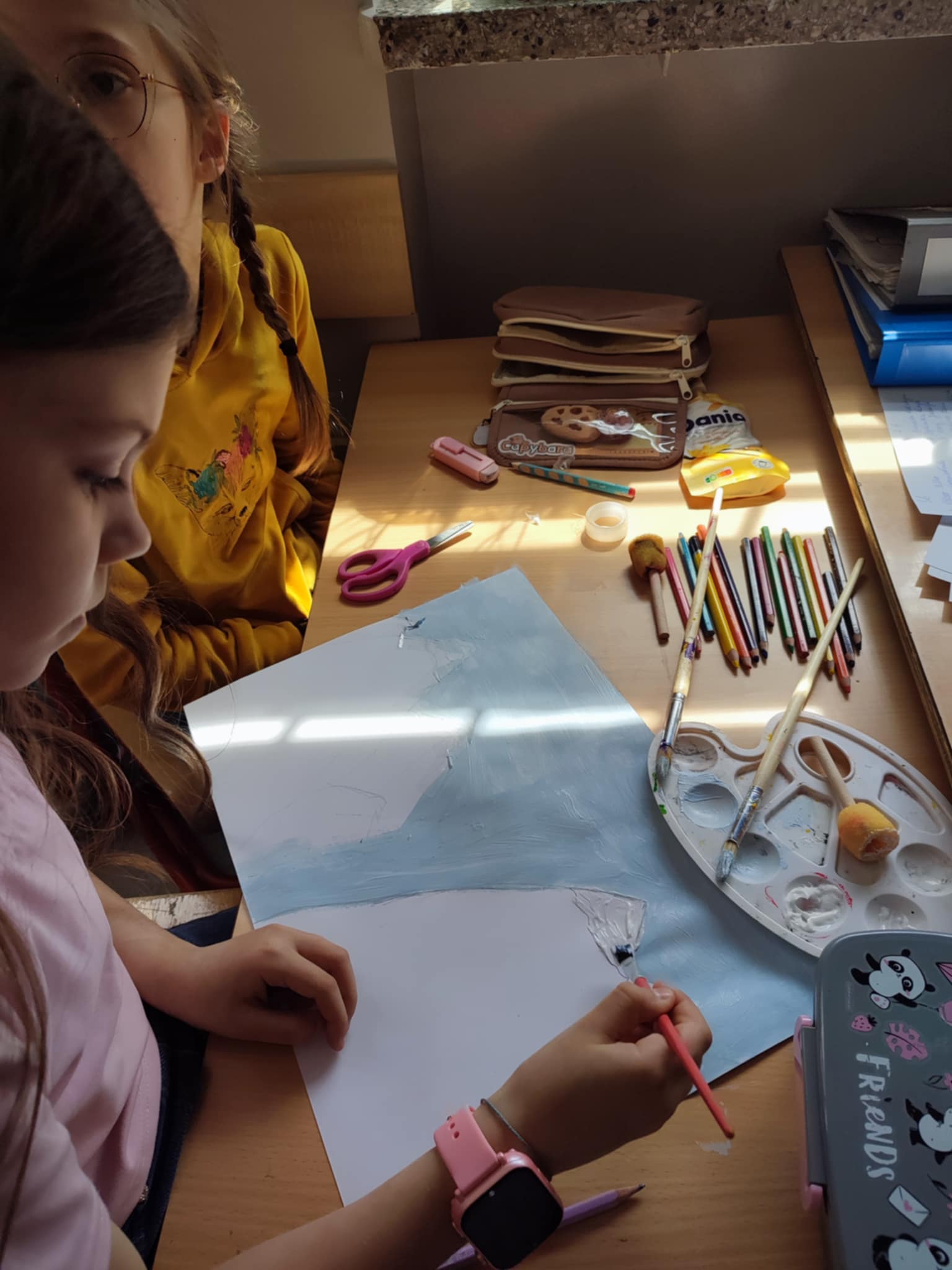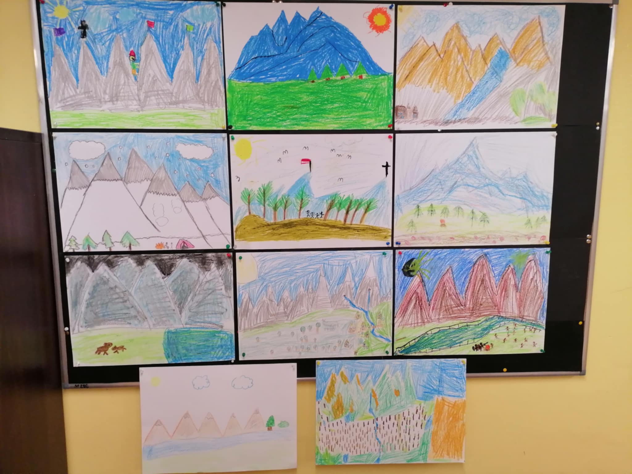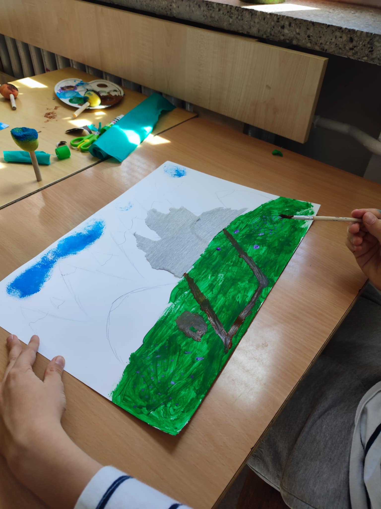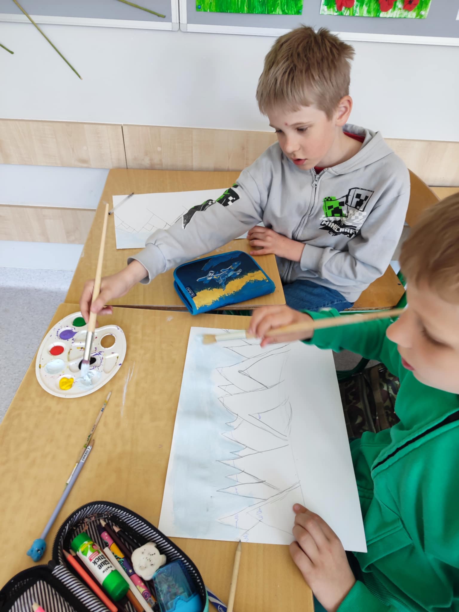 Pejzaż górski w wykonaniu uczniów 1c i dziewczynek z 4B i 4c.