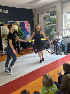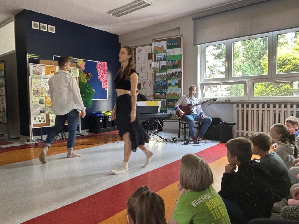 We wtorek obejrzeliśmy ostatni w tym roku szkolnym koncert w wykonaniu artystów z Filharmonii Narodowej. Było bardzo energetycznie za sprawą rock and rolla – tańca, który powstał w Stanach Zjednoczonych w połowie lat pięćdziesiątych XX wieku. Jest to styl, który łączy elementy kilku gatunków, tworząc unikalną mieszankę skoków, obrotów i akrobacji. Parze tancerzy towarzyszyły: saksofon, gitara i fortepian.