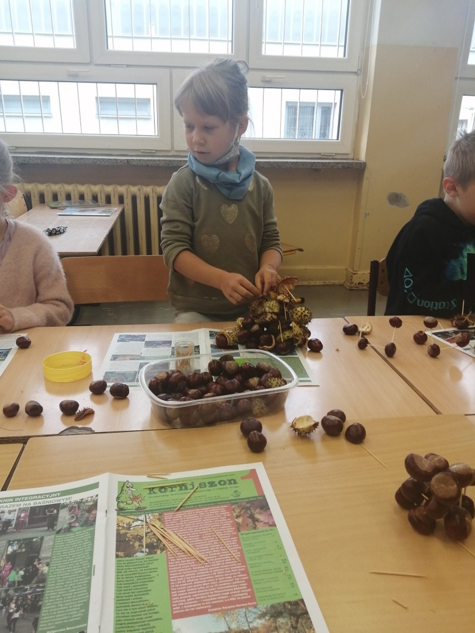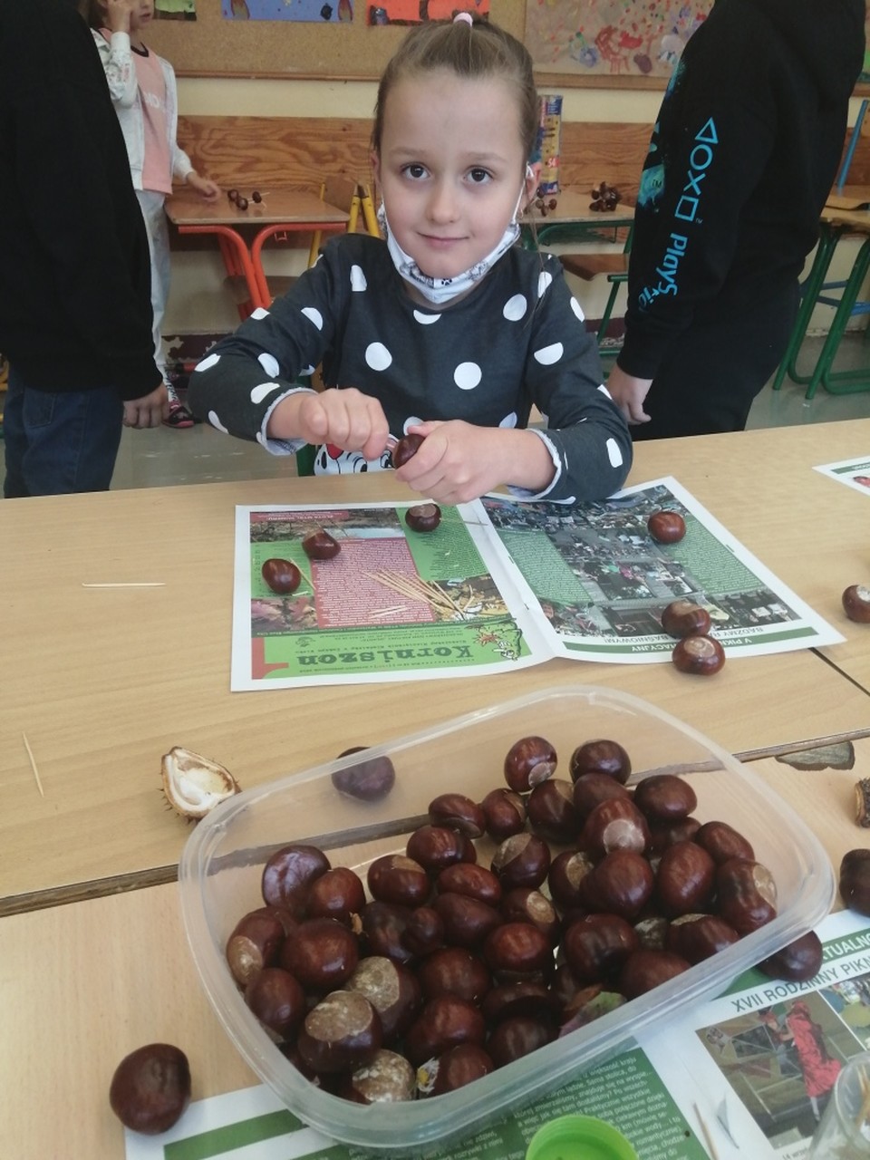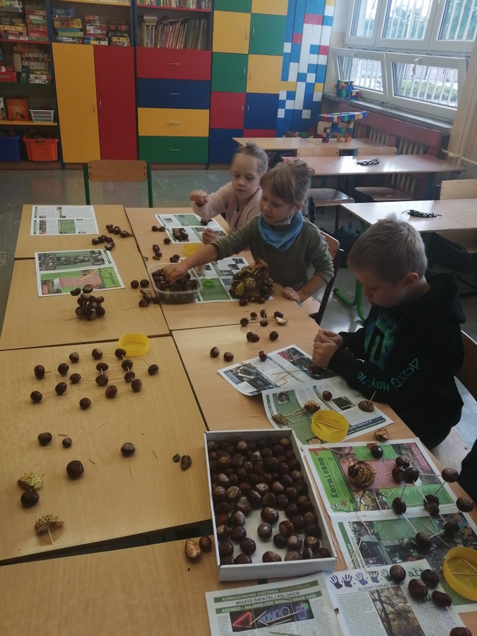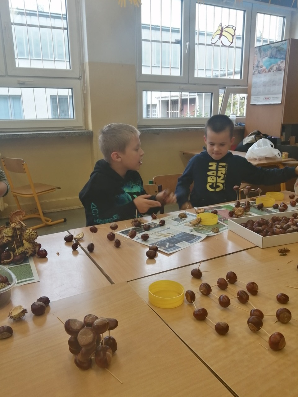 Uczniowie z dużym zaangażowaniem i według własnych pomysłów, tworzyli postacie, zwierzęta i przedmioty z kasztanów, wykałaczek i plasteliny. Kasztany zbierali wspólnie na terenie szkoły.