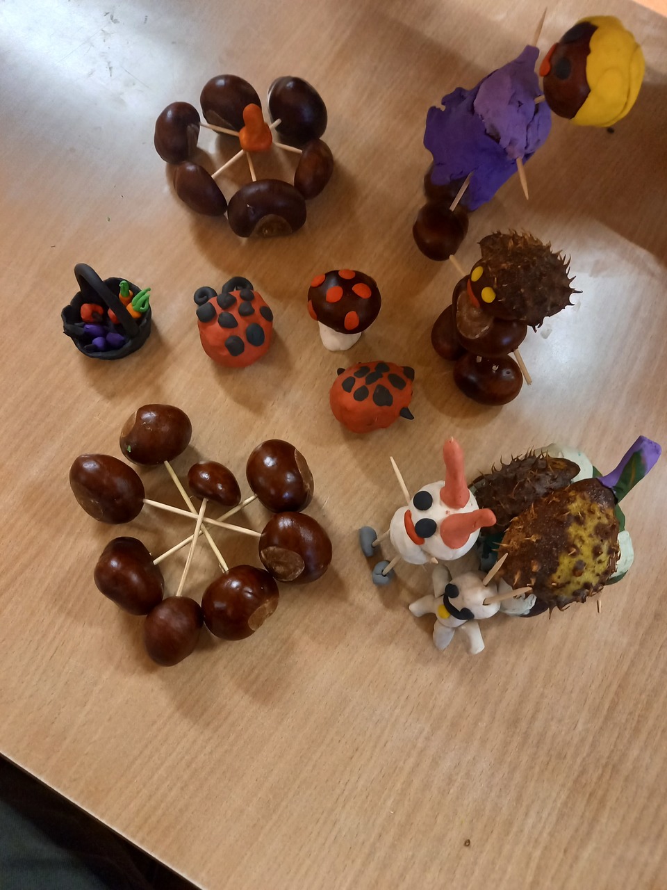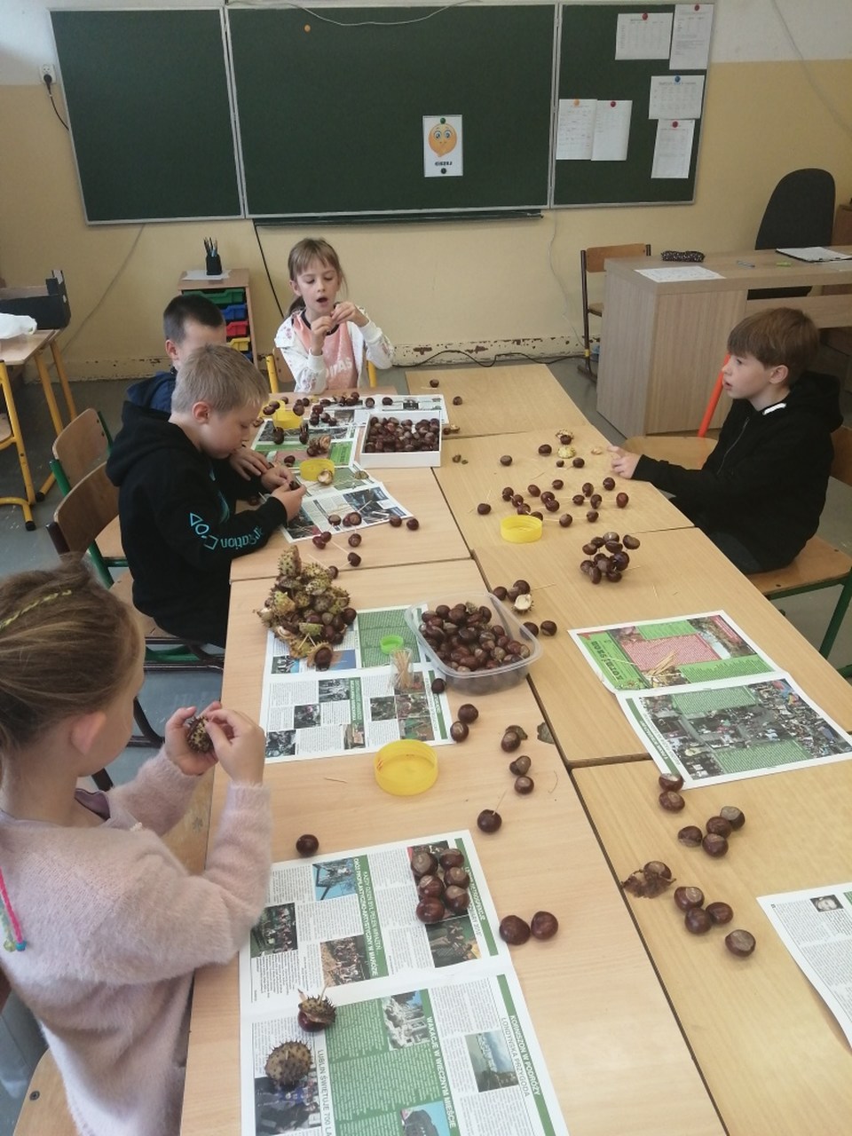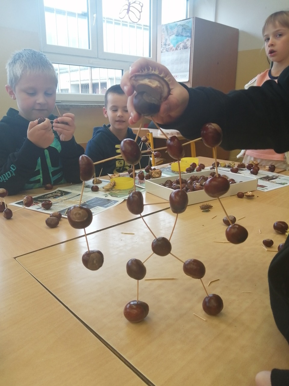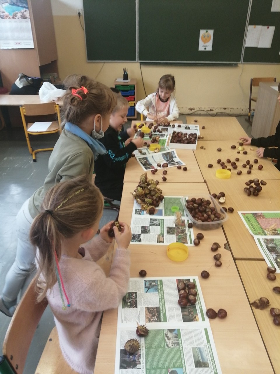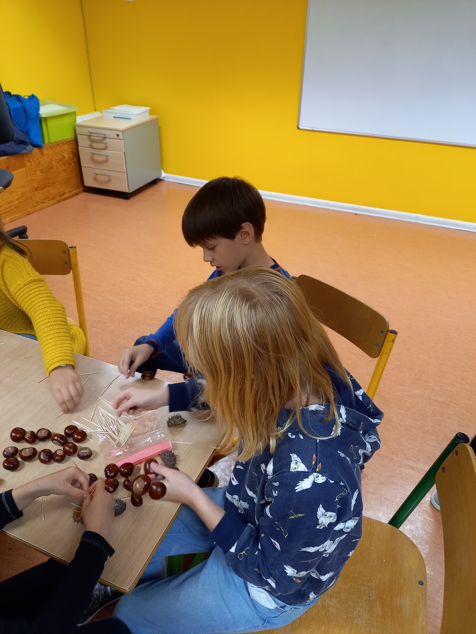 Uczniowie z dużym zaangażowaniem i według własnych pomysłów, tworzyli postacie, zwierzęta i przedmioty z kasztanów, wykałaczek i plasteliny. Kasztany zbierali wspólnie na terenie szkoły.