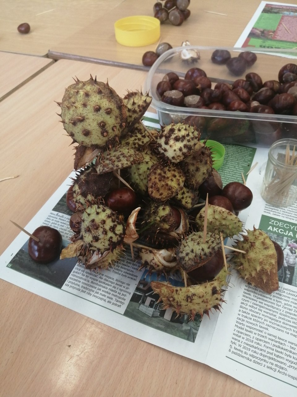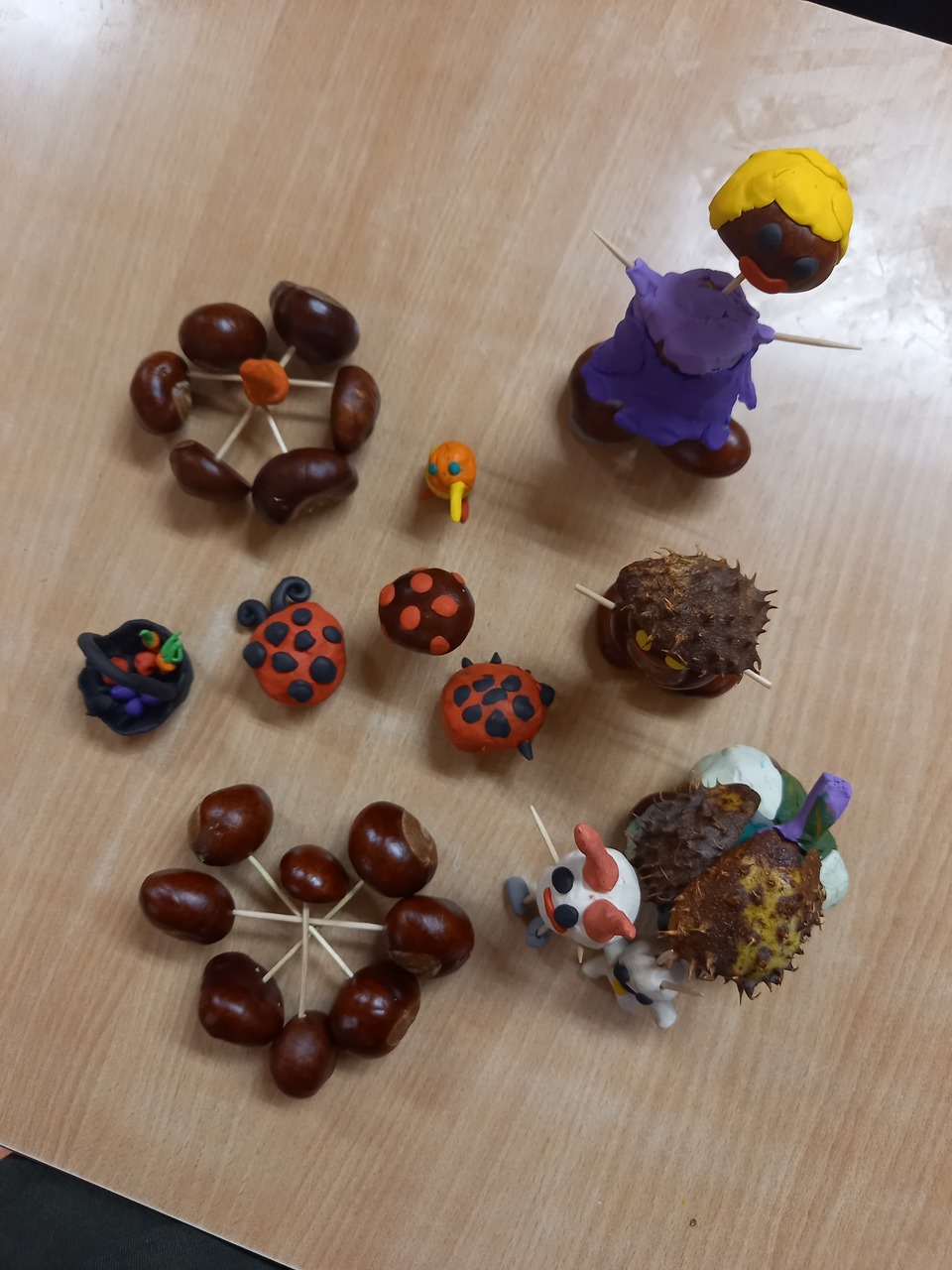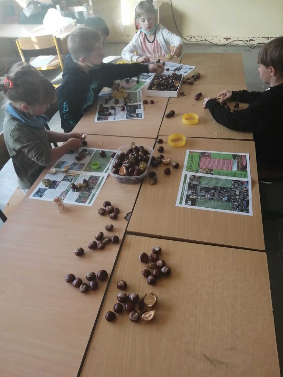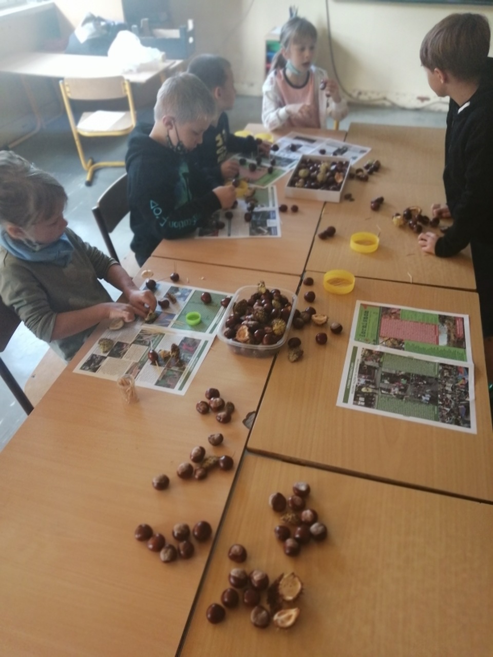 Uczniowie z dużym zaangażowaniem i według własnych pomysłów, tworzyli postacie, zwierzęta i przedmioty z kasztanów, wykałaczek i plasteliny. Kasztany zbierali wspólnie na terenie szkoły.