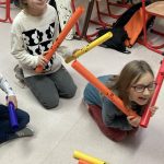 Pewnego dnia, uczniowie kl 4a i 4b poznali zasady gry na plastikowych bum bum rurkach. Potem przeszli do kolorowych zapisów melodii, gdzie każdy kolor oznaczał inny dźwięk.