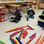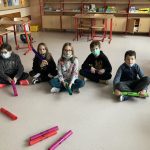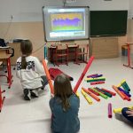 Pewnego dnia, uczniowie kl 4a i 4b poznali zasady gry na plastikowych bum bum rurkach. Potem przeszli do kolorowych zapisów melodii, gdzie każdy kolor oznaczał inny dźwięk.