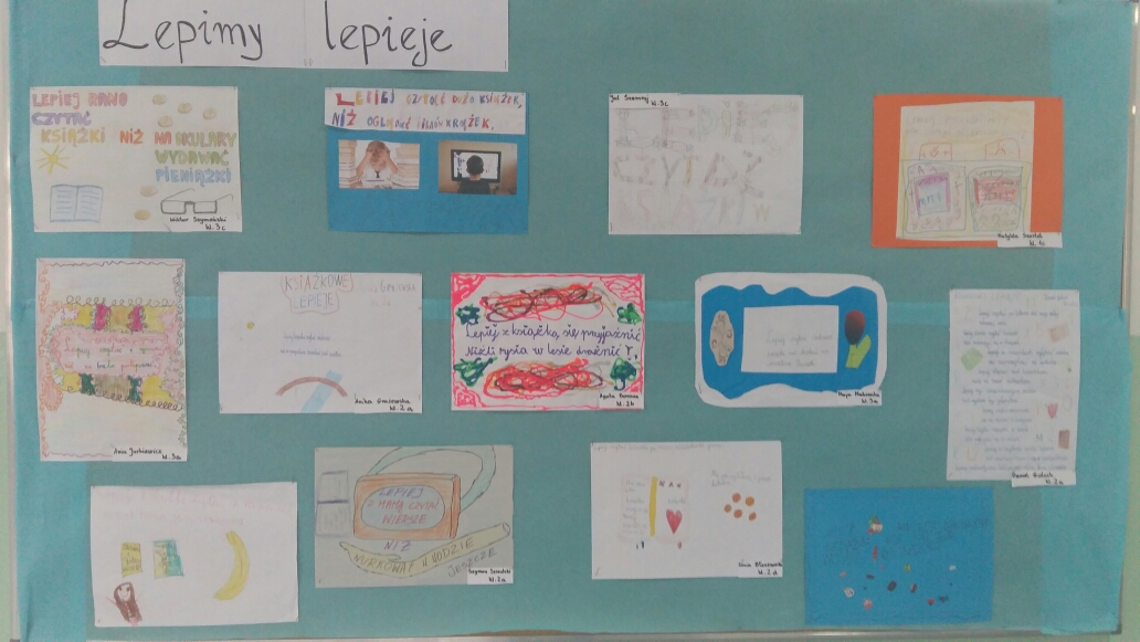 Na przełomie października i listopada, w naszej świetlicy odbył się konkurs literacki „Lepimy lepieje”, w kórym wzięły udział wszystkie grupy świetlicowe. Ilość prac jaka spłynęła do organizatorów przeszła nasze najśmielsze oczekiwania! Wszystkie prace, zawisły na tablicach parteru, by cieszyć oko przechodniów. Rozdanie nagród za ten jakże kreatywny konkurs odbędzie się pod koniec listopada. Czekamy z niecierpliwością na werdykt jury, a tym czasem zapraszamy do oglądania i czytania wszystkich wywieszonych dzieł.