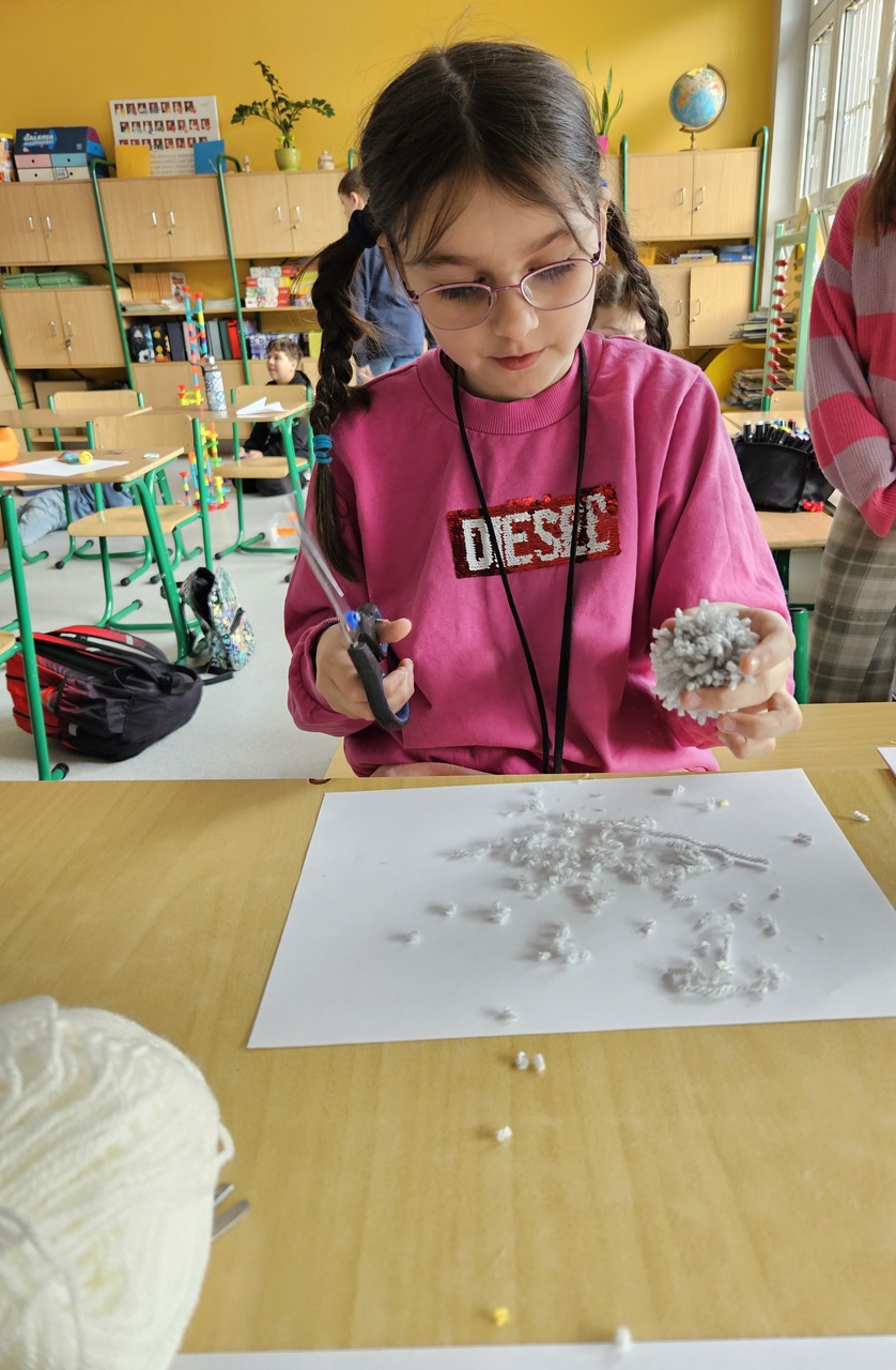 Uczniowie własnoręcznie wykonali prace, takie jak: zajączki, baranki, kurczaki z włóczki, magnesy z powyższym motywem oraz koszyczki z kubeczków. Dzieci wkładały w swoje dzieła dużo serca, cierpliwości i radości.