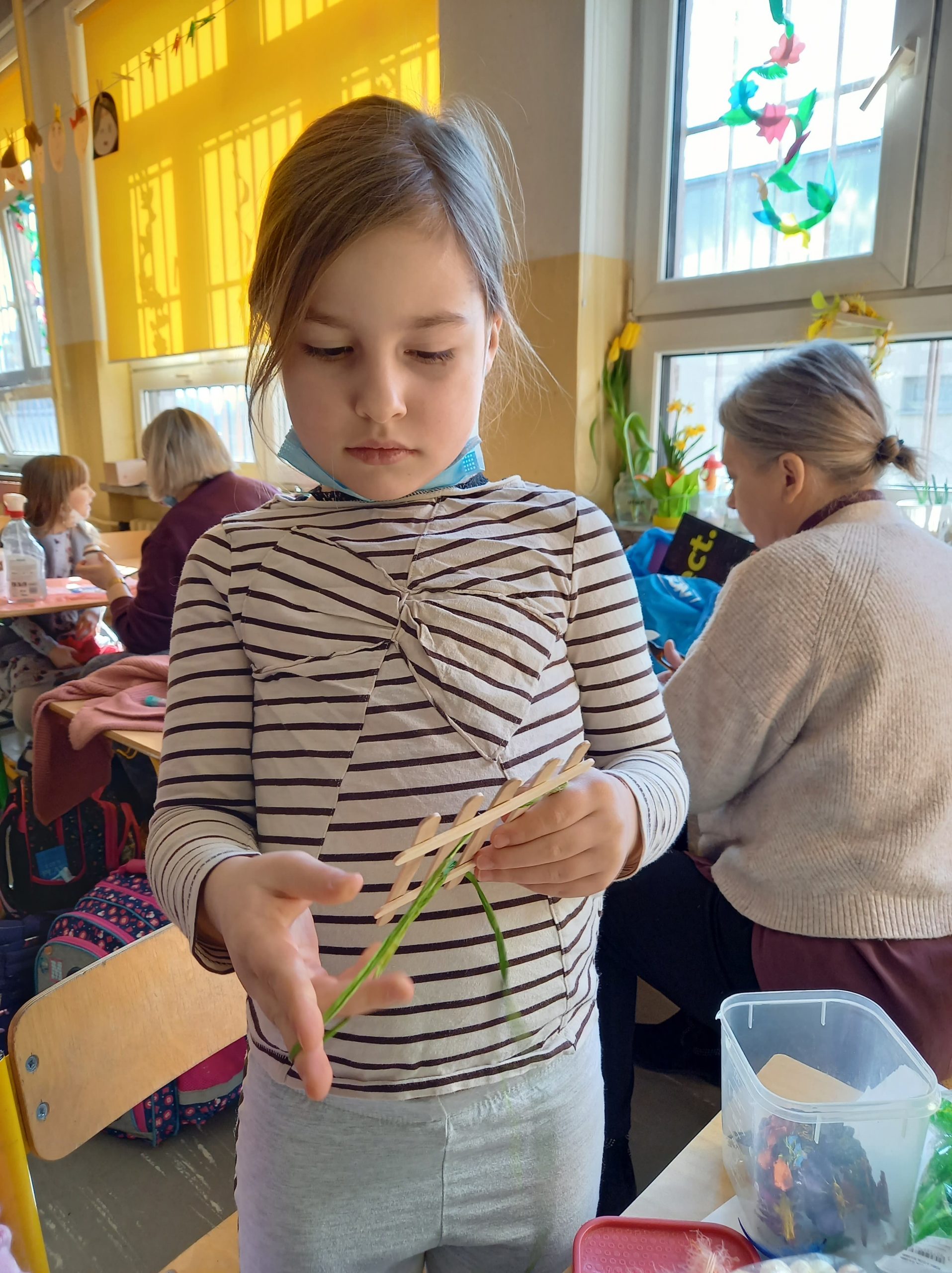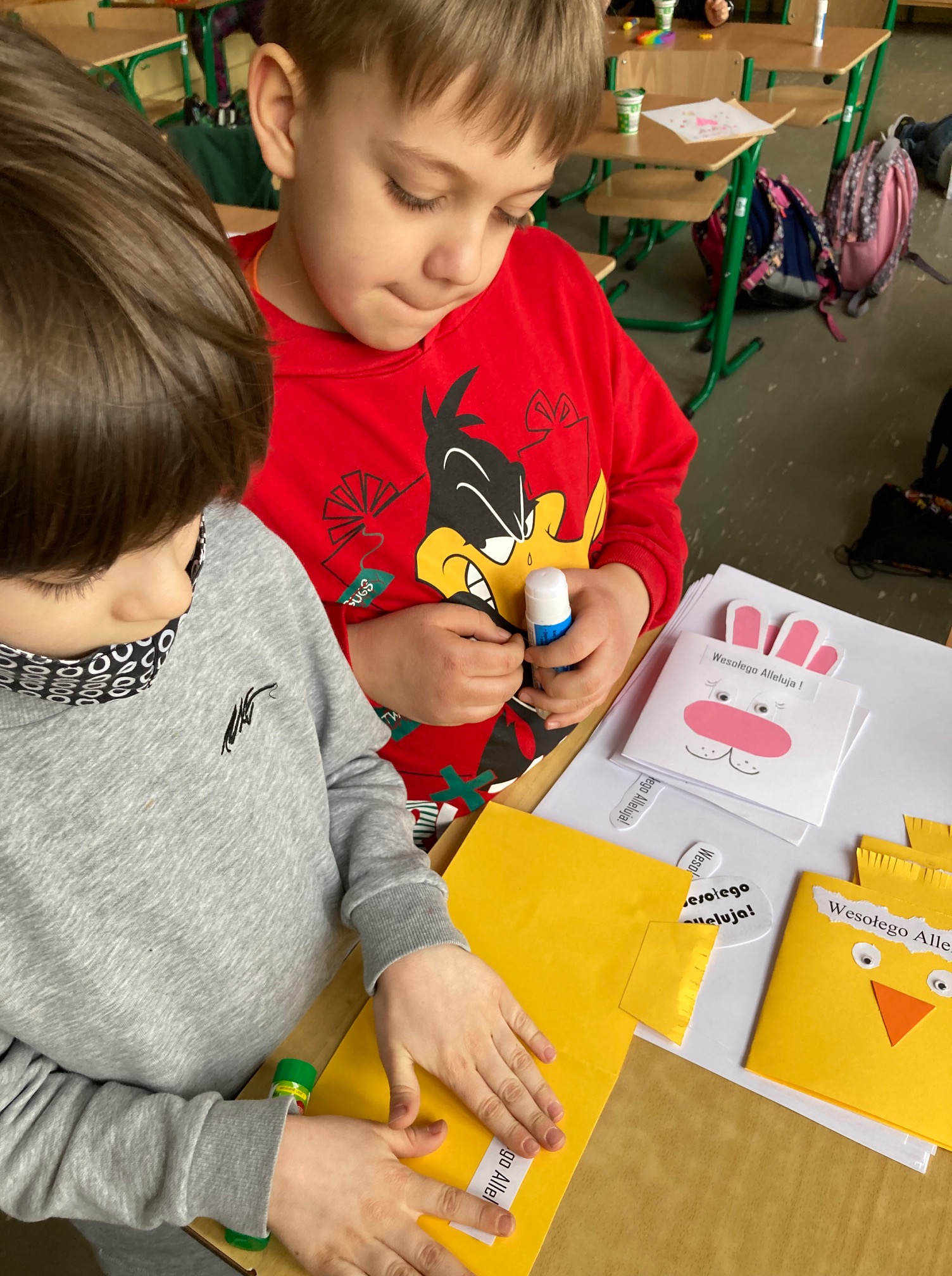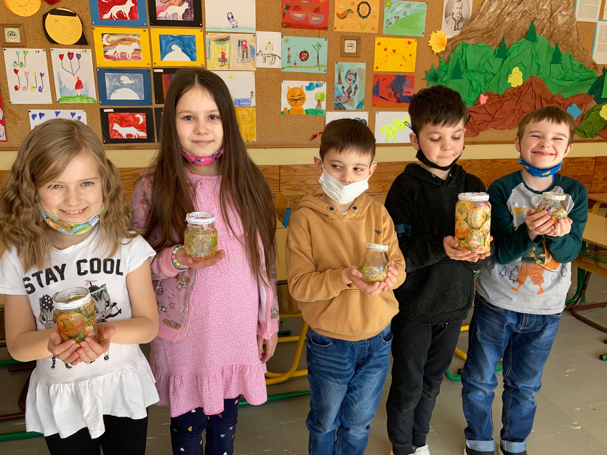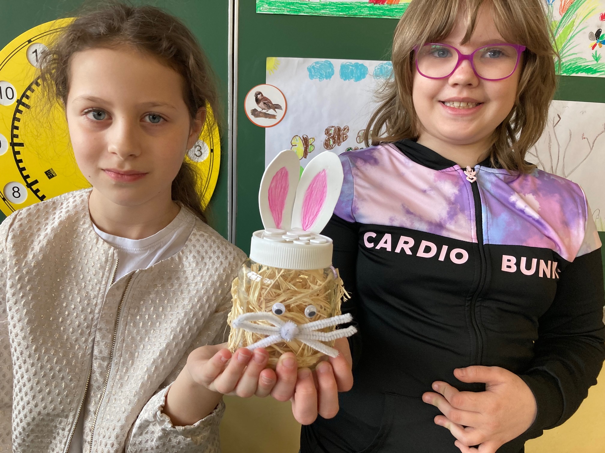 Klasa IIb wzięła udział w przygotowywaniu ekologicznych ozdób na kiermasz wielkanocny oraz kartek z życzeniami dla emerytowanych nauczycieli.