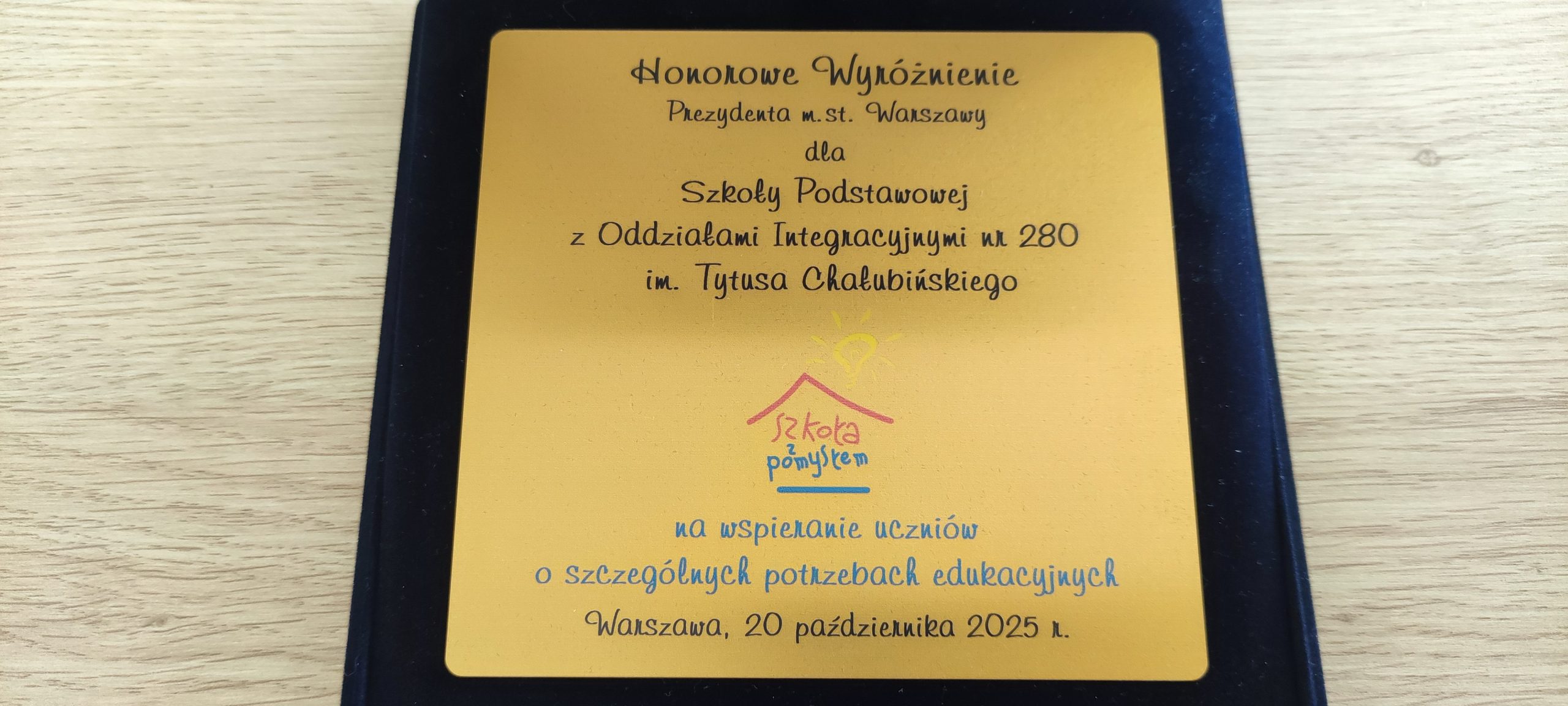 Nasza szkoła otrzymała honorowe Wyróżnienie Prezydenta m.st. Warszawy za projekt „Szkoła z pomysłem na wspieranie uczniów o szczególnych potrzebach edukacyjnych”. Cel projektu zakładał promowanie innowacyjnych i kreatywnych działań realizowanych przez cały rok szkolny. Zespół pedagogów specjalnych skupił się na problematyce zdrowia psychicznego. Podejmowaliśmy aktywności mające na celu wspieranie i profilaktykę radzenia sobie ze stresem. Jesteśmy bardzo dumni, że nasze działania przyniosły skutek, a szkoła została w ten sposób wyróżniona. Dzięki temu możemy dzielić się wartościowymi praktykami, które sprzyjają budowaniu dobrej atmosfery w placówce.