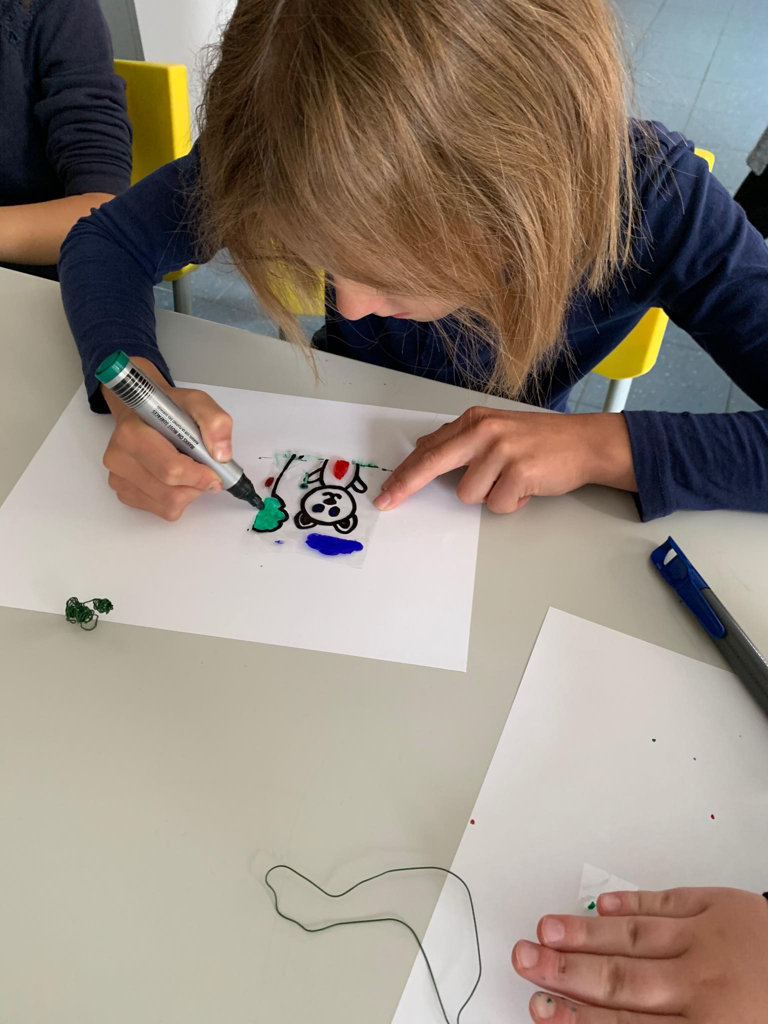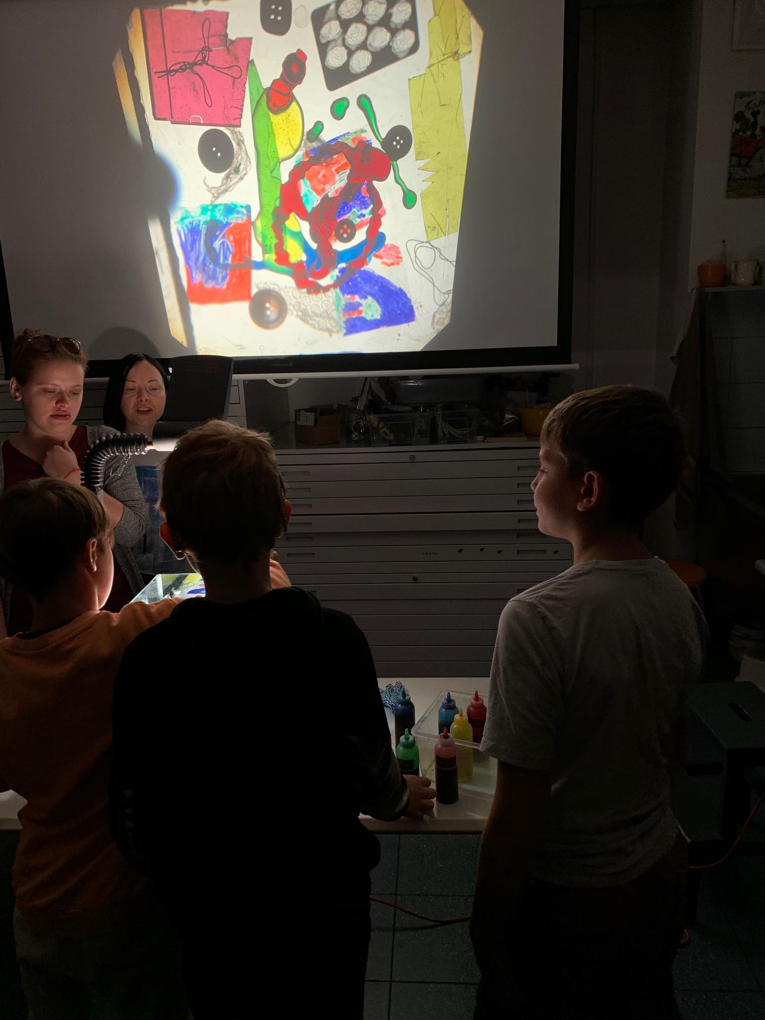 3. Wkładanie wszystkich naszych prac do pojemnika i zabawa kolorowymi płynami – z tego powstały fluidacje.